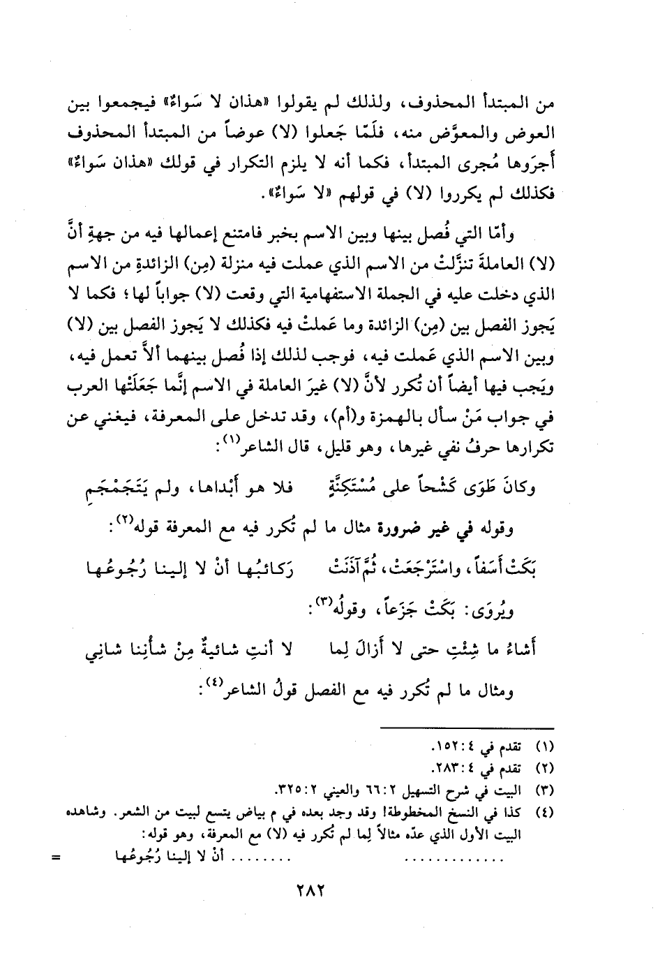 من المبتدأ المحذوف، ولذلك لم يقولوا "هذان لا سواءٌ" فيجمعوا بين العوض والمعوض منه، فلما جعلوا (لا) عوضًا من المبتدأ المحذوف أجروها مُجرى المبتدأ، فكما أنه لا يلزم التكرار في قولك "هذان سواءٌ" فكذلك لم يكرروا (لا) في قولهم "لا سواءٌ".