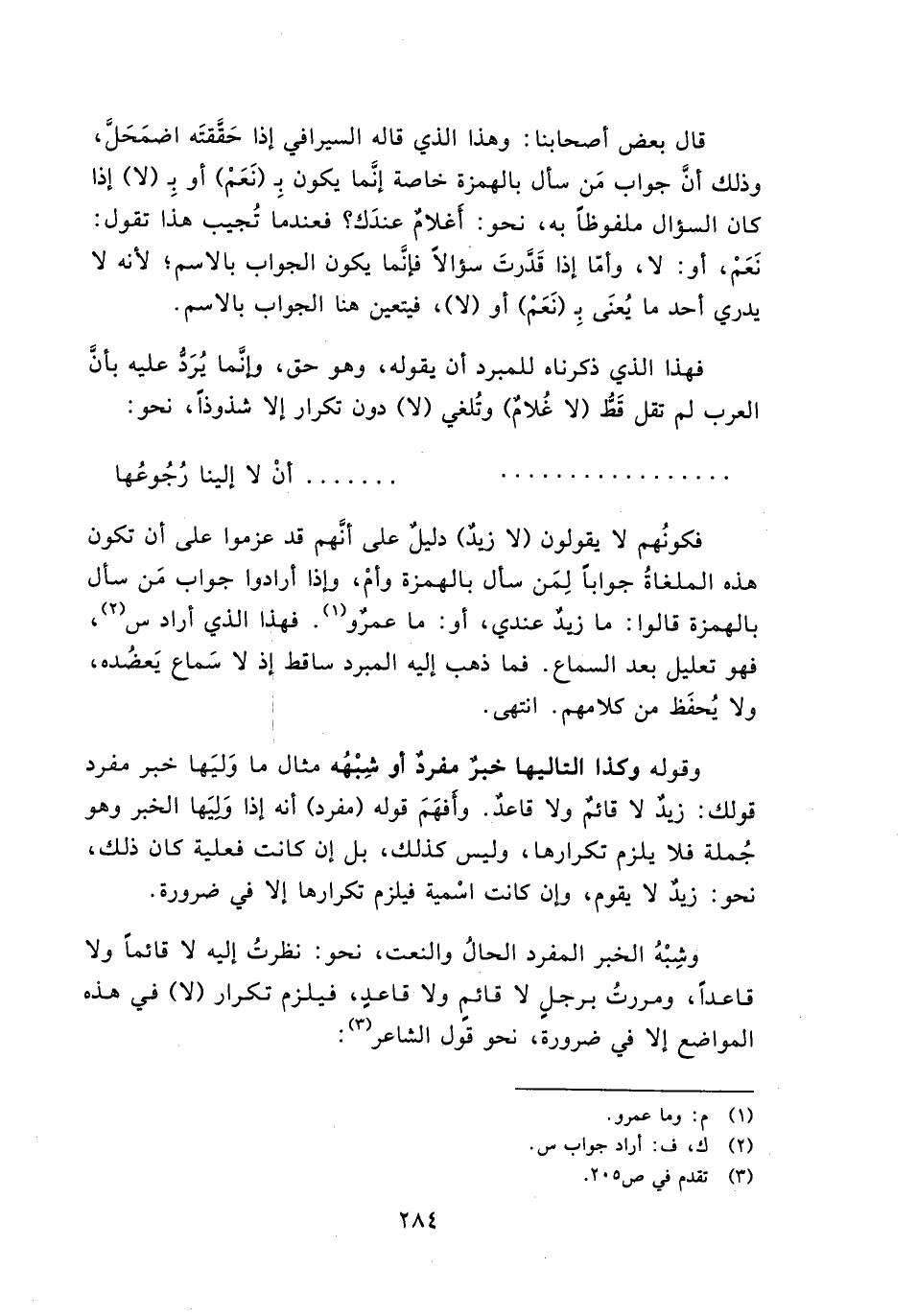 قال بعض أصحابنا: وهذا الذي قاله السيرافي إذا حققته اضمحل، وذلك أن جواب من سأل بالهمزة خاصة إنما يكون بـ (نعم) أو بـ (لا) إذا كان السؤال ملفوظًا به، نحو: أغلامٌ عندك؟ فعندما تُجيب هذا تقول: نعم، أو: لا، وأما إذا قدرت سؤالًا فإنما يكون الجواب بالاسم؛ لأنه لا يدري أحد ما يُعني بـ (نعم) أو (لا)، فيتعين هنا الجواب بالاسم.