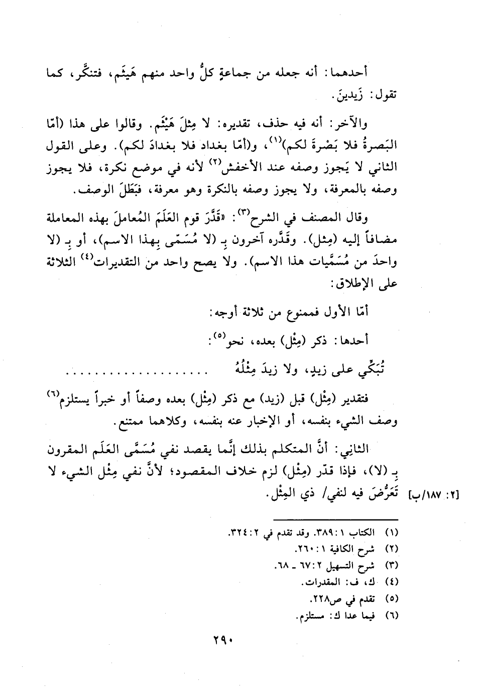 وقال المصنف في الشرح: "قدر قوم العلم المعامل بهذه المعاملة مضافًا إليه (مثل). وقدره آخرون بـ (لا مُسمى بهذا الاسم)، أو بـ (لا واحد من مسميات هذا الاسم). ولا يصح واحد من التقديرات الثلاثة على الإطلاق: