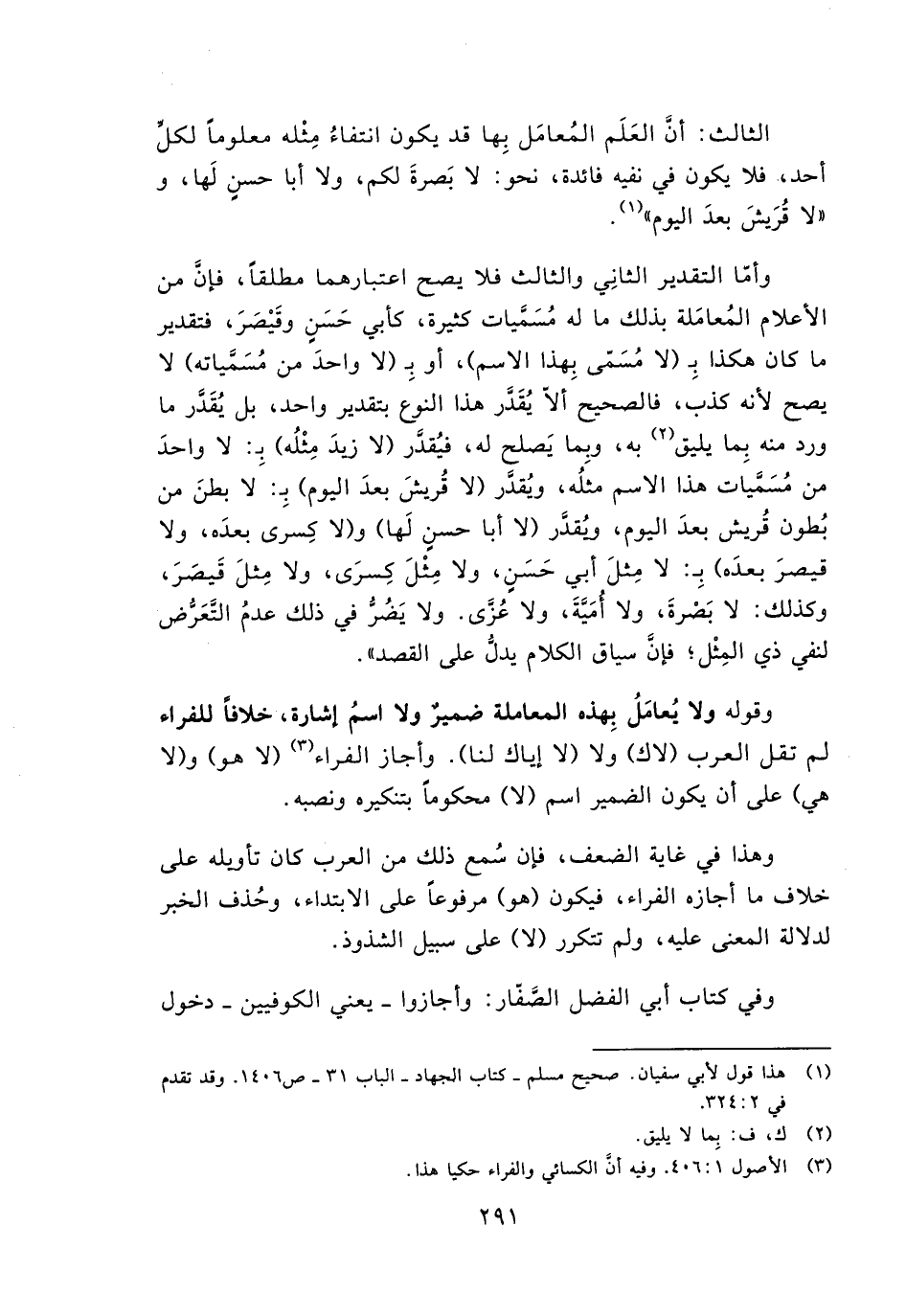 وأما التقدير الثاني والثالث فلا يصح اعتبارهما مطلقًا، فإن من الأعلام المُعاملة بذلك ما له مُسميات كثيرة، كأبي حسنٍ وقيصر، فتقدير ما كان هكذا بـ (لا مُسمى بهذا الاسم)، أو بـ (لا واحد من مُسمياته) لا يصح لأنه كذب، فالصحيح ألا يُقدر هذا النوع بتقدير واحد، بل يُقدر ما ورد منه بما يليق به، وبما يصلح له، فيُقدر (لا زيد مثله) بـ: لا واحد من مُسميات هذا الاسم مثله، ويُقدر (لا قريش بعد اليوم) بـ: لا بطن من بطون قريش بعد اليوم، ويُقدر (لا حسنٍ لها) و (لا كسرى بعده، ولا قيصر بعده) بـ: لا مثل أبي حسنٍ، ولا مثل كسرى، ولا مثل قيصر، وكذلك: لا بصرة، ولا أمية، ولا عزى. ولا يضر في ذلك عدم التعرض لنفي ذي المثل؛ فإن سياق الكلام يدل على القصد".