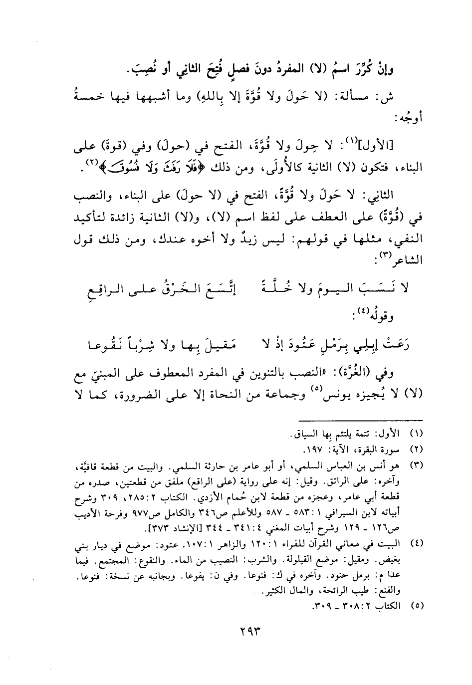 [الأول]: لا حول ولا قوة، الفتح في (حول) وفي (قوة) على البناء، فتكون (لا) الثانية كالأولى، ومن ذلك {فَلاَ رَفَثَ وَلاَ فُسُوقَ}.