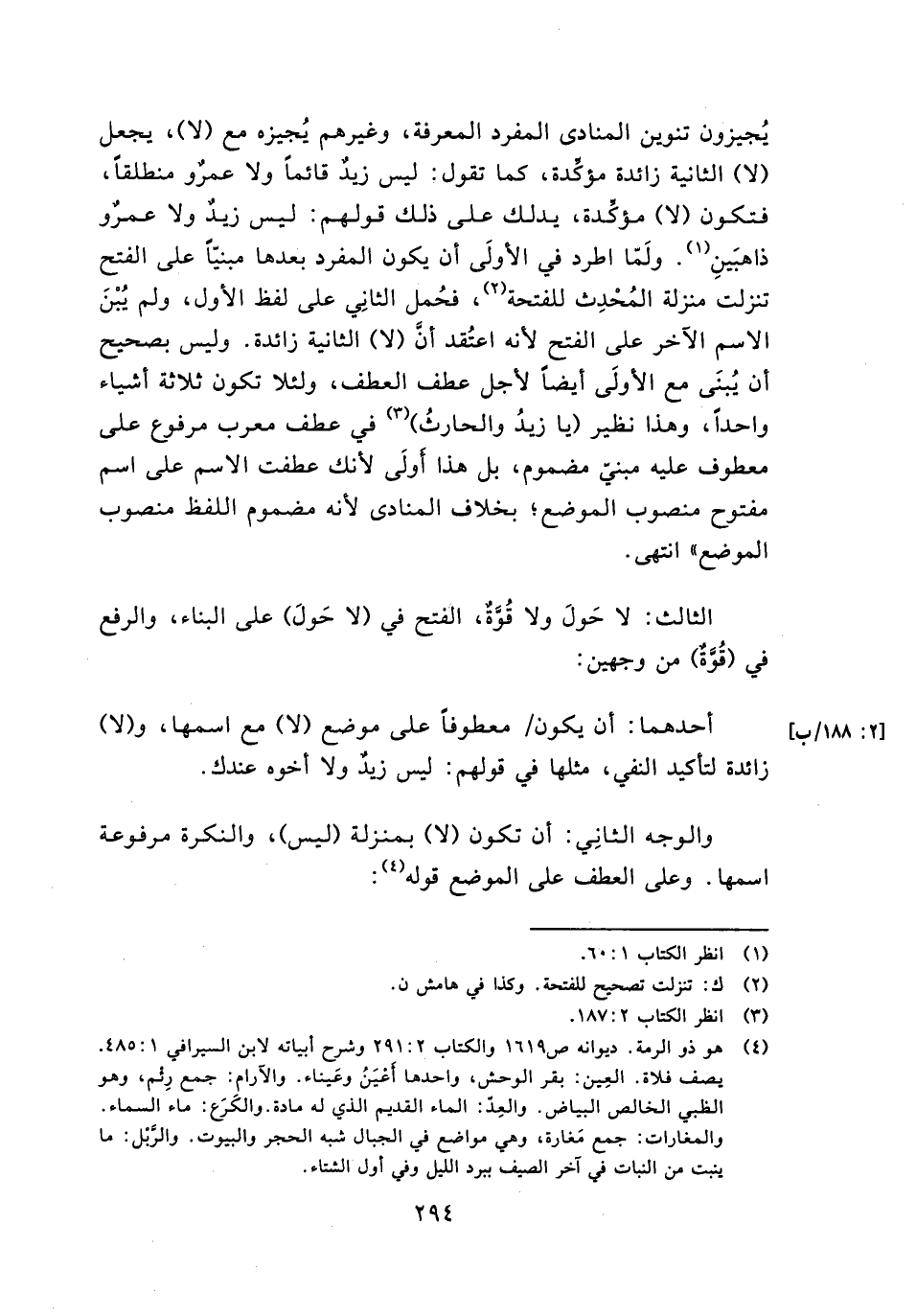 يُجيزون تنوين المنادى المفرد المعرفة، وغيرهم يُجيزه مع (لا)، يجعل (لا) الثانية زائدة مؤكدة، كما تقول: ليس زيدٌ قائمًا ولا عمروٌ منطلقًا، فتكون (لا) مؤكدة، يدلك على ذلك قولهم: ليس زيدٌ ولا عمروٌ ذاهبين. ولما اطرد في الأولى أن يكون المفرد بعدها مبنيًا على الفتح تنزلت منزلة المُحدث للفتحة، فحُمل الثاني على لفظ الأول، ولم يُبن الاسم الآخر على الفتح لأنه اعتُقد أن (لا) الثانية زائدة. وليس بصحيح أن يُبنى مع الأولى أيضًا لأجل عطف العطف، ولئلا تكون ثلاثة أشياء واحدًا، وهذا نظير (يا زيد والحارث) في عطف معرب مرفوع على معطوف منصوب الموضع؛ بخلاف المنادى لأنه مضموم اللفظ منصوب الموضع" انتهى.