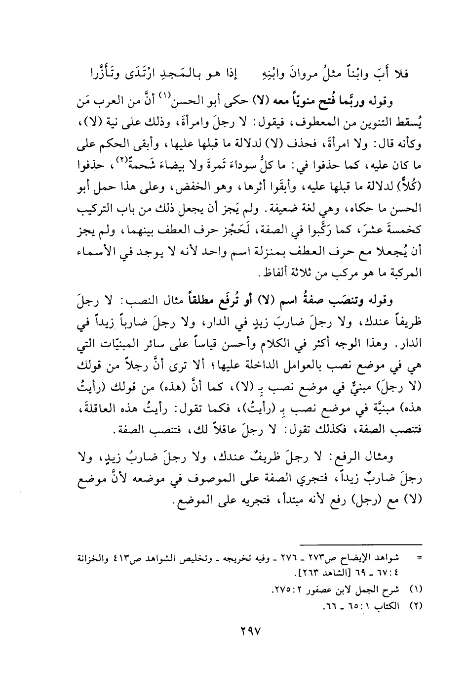 وقوله وتنصب صفة اسم (لا) أو تُرفع مطلقًا مثال النصب: لا رجل ظريفًا عندك، ولا رجل ضارب زيدٍ في الدار، ولا رجل ضاربًا زيدًا في الدار. وهذا الوجه أكثر في الكلام وأحسن قياسًا على سائر المبنيات التي هي في موضع نصب بالعوامل الداخلة عليها؛ ألا ترى أن رجلًا من قولك (لا رجل) مبنيٌ في موضع نصب بـ (لا)، كما أن (هذه) من قولك (رأيت هذه) مبنية في موضع نصب بـ (رأيت)، فكما تقول: رأيت هذه العاقلة، فتنصب الصفة، فكذلك تقول: لا رجل عاقلًا لك، فتنصب الصفة.