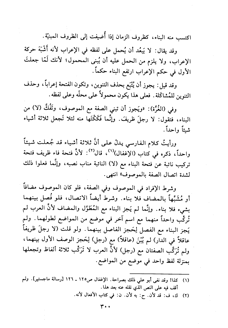 ورأيت كلام الفارسي يدل على أن ثلاثة أشياء قد جُعلت شيئًا واحدًا، ذكره في كتاب (الإغفال)، قال: لأن فتحة فاء ظريف فتحة تركيب نائبة عن فتحة البناء مع (لا) النائبة مناب نصبه، وإنما فعلوا ذلك لشدة اتصال الصفة بالموصوف" انتهى.