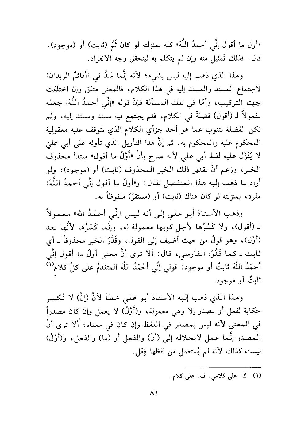وهذا الذي ذهب إليه ليس بشيء, لأنه إنما سد في " أقائم الزيدان"لاجتماع المسند والمسند إليه في هذا الكلام , فالمعنى متفق وإن اختلفت جهتا التركيب وأما في تلك المسألة فإن قوله"إني أحمد الله" جعله مفعولاً لـ (أقول) فضلة في الكلام, فلم يجتمع فيه مسند ومسند إليه ولم تكن الفضلة لتنوب عما هو أحد جزأي الكلام الذي يتوقف عليه معقولية المحكومة عليه والمحكوم به, ثم إن هذا التأويل الذي تأوله على أبي علي لا ينزل عليه لفظ أبي علي لأنه صرح بأن "أول ما أقول" مبتدأ محذوف الخبر, وزعم أن تقدير ذلك الخبر المحذوف (ثابت) أو (موجو) ولو أراد ما ذهب إليه هذا المنفصل لقال: و"أول ما أقول إني أحمد الله" مفرد بمنزلته لو كان هناك (ثابت) أو (مستقر) ملفوظاً به.