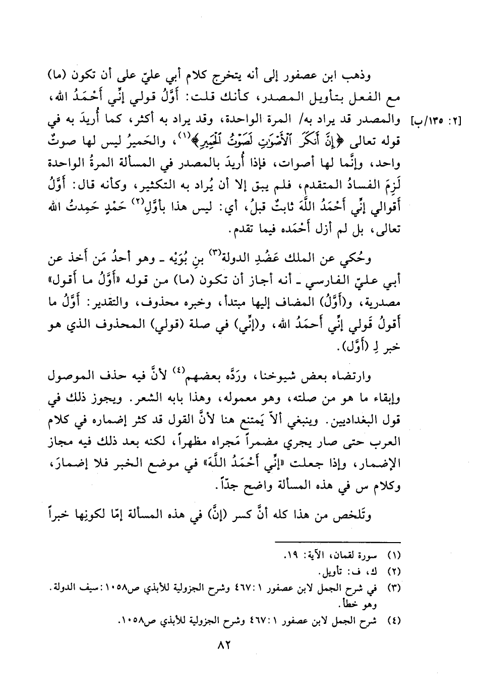 وذهب ابن عصفور إلى أنه يتخرج كلام أبي غلي على أن تكون (ما) مع الفعل بتأويل المصدر, كأنك قلت: أول قولي إني أحمد الله, والمصدر قد يراد به/ المرة الواحدة , وقد يراد به أكثر كما أريد به في قوله تعالى {إِنَّ أَنكَرَ الأَصْوَاتِ لَصَوْتُ الْحَمِيرِ} , والحمير ليس لها صوت واحد وإنما لها أصوات فإّا أريد بالمصدر في المسألة المرة الواحدة لزم الفساد المتقدم فلم يبق إلا أن يراد التكثير وكأنه قال: أول أقوالي إني أحمد الله ثابت قبل, أي: ليس هذا بأول حمد حمدت الله تعالى بل لك أزل أحمده فيما تقدم.