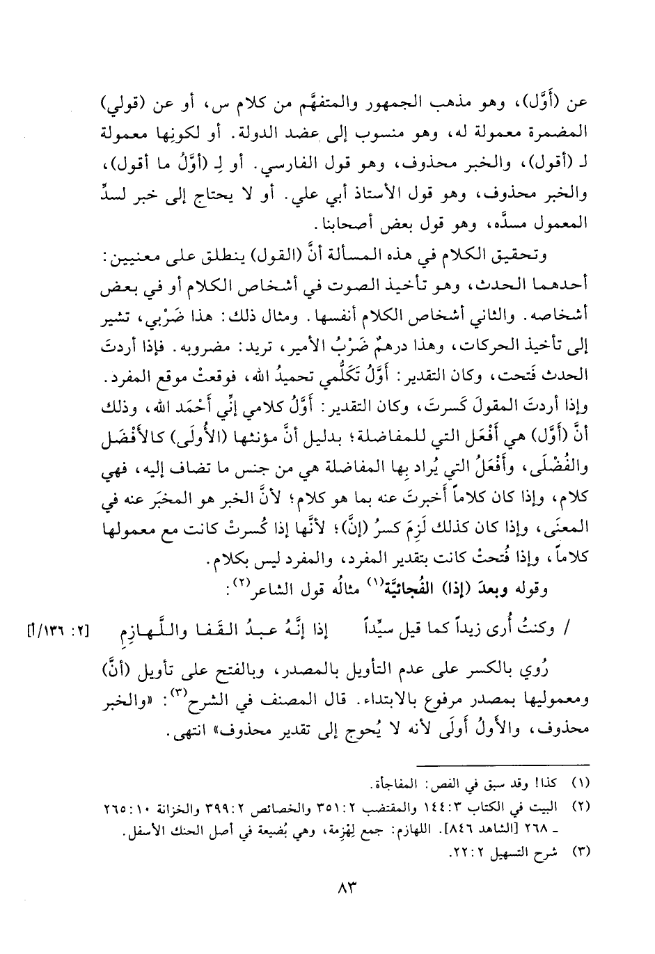 وتحقيق الكلام في هذه المسألة أن (القول) ينطلق على معنيين: أحدهما الحدث, وهو تأخيذ الصوت في أشخاص الكلام أو في بعض أشخاصه, والثاني أشخاص الكلام أنفسها ومثال ذلك: هذا ضربي, تشير إلى تأخيذ الحركات وهذا درهم ضرب الأمير , تريد: مضروبة. فإذا أردت الحدث فتحت, وكان التقدير: أول تكلمي تحميد الله فوقعت موقع المفرد.