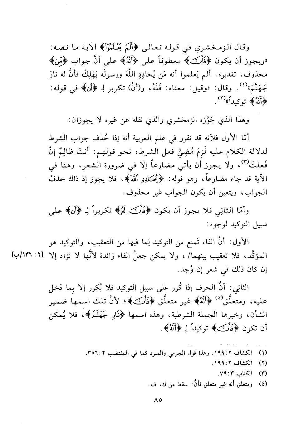 وقال الزمخشري في قوله تعالى {أَلَمْ يَعْلَمُوا} الآية ما نصه: " ويجوز أن يكون {فَأَنّ} معطوفاً على {أَنَّهُ} على أن جواب {مَن} محذوفة, وتقديره: ألم يعلموا أنه من يحادد الله ورسوله يهلك فأن له نار جهنم". وقال:" وقيل: معناه فله, و (أن) تكرير لـ {أَنَّ} في قوله: {أَنَّهُ} توكيداً.