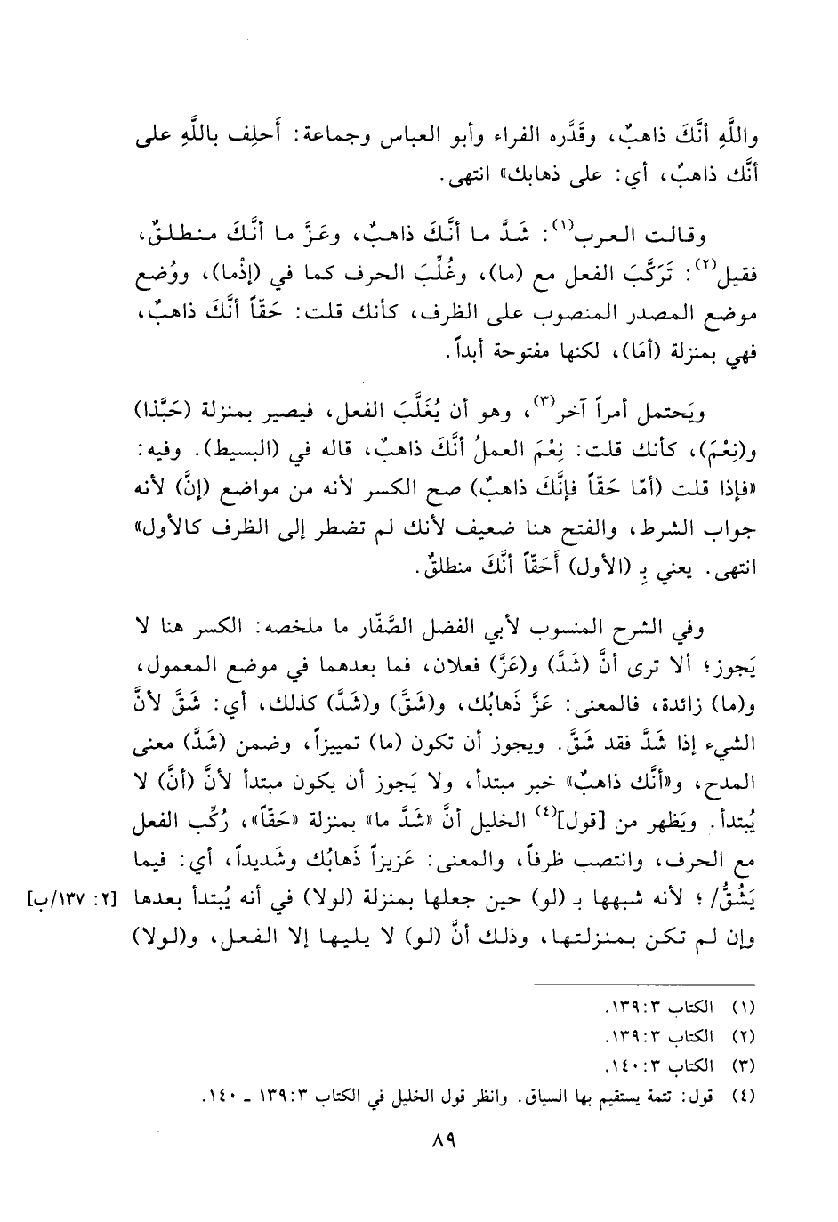 وفي الشرح المنسوب لأبي الفضل الصفار ما ملخصه: الكسر هنا لا يجوز, ألا ترى أن (شد) و (عز) فعلان, فما بعدهما في موضع المعمول, و (ما) زائدة فالمعنى: عز ذهابك و (شق) و (شد) كذلك أي: شق لأنك الشيء إذا شد فقد شق. ويجوز أن تكون (ما) تمييزاً, وضمن (شد) معنى المدح و"أنك ذاهب" خبر مبتدأ ولا يجوز أن يكون مبتدأ لأن (أن) لا يبتدئ ويظهر من [قول] الخليل أن "شد ما" بمنزلة "حقا" ركب الفعل مع الحرف , وانتصب ظرفاً والمعنى: عزيزاً ذهابك وشديداً , أي: فيما يشق/ لأنه شبهها بـ (لو) حين جعلها بمنزلة (لولا) في أنه يبتدئ بعدها وإن لم تكن بمنزلتها وذلك أن (لو) لا يليها إلا الفعل , و (لولا)
