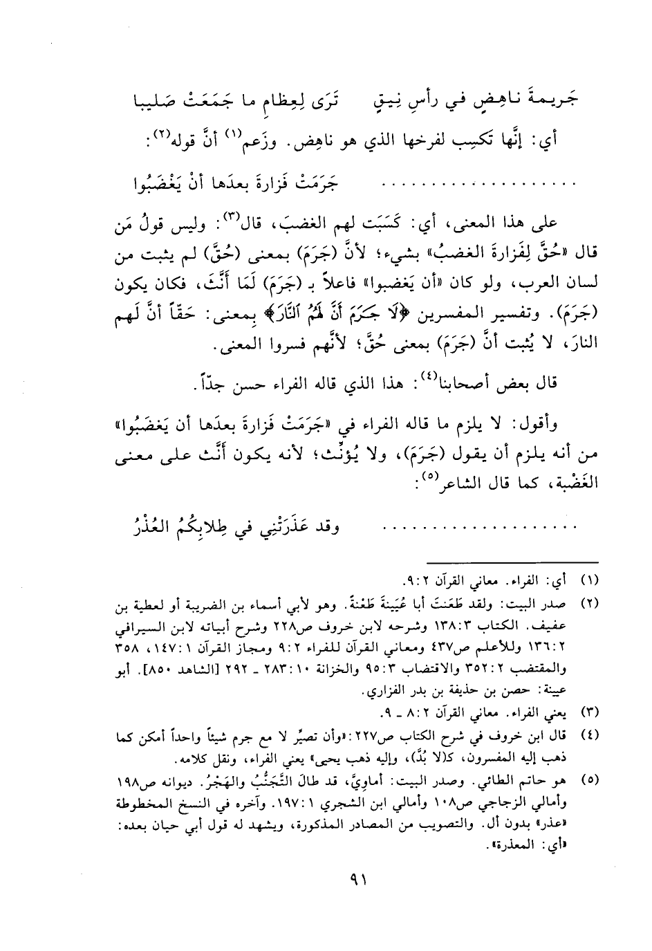 وأقول: لا يلزم ما قاله الفراء في "جرمت فزارة بعدها أن يغضبوا" من أنه يلزم أن يقول (جرم) ولا يؤنث, لأنه يكون أنث على معنى الغضبة, كما قال الشاعر: