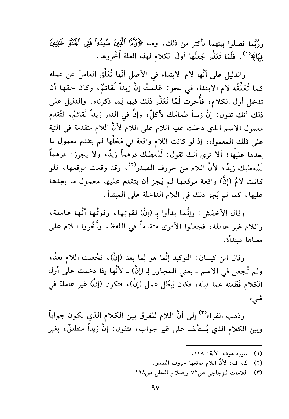 وربما فصلوا بينهما بأكثر من ذلك, ومنه {وَأَمَّا الَّذِينَ سُعِدُوا فَفِي الْجَنَّةِ خَالِدِينَ فِيهَا}. فلما تعذر جعلها أول الكلام لهذه العلة أخروها.