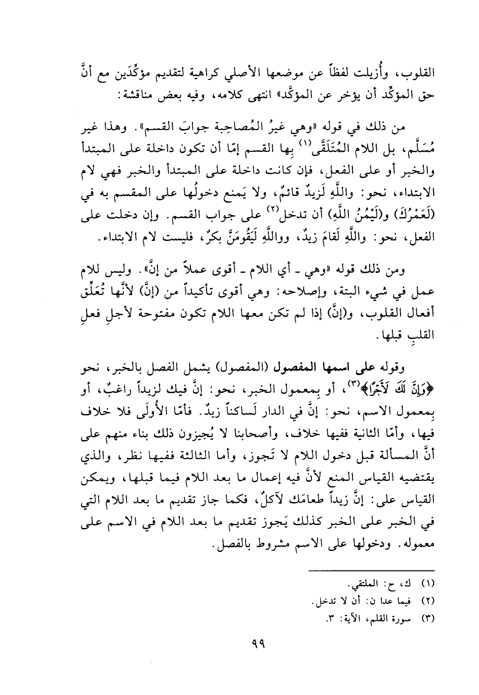 من ذلك في قوله" وهي غير المصاحبة جواب القسم". وهذا غير مسلم, بل اللام المتلقي بها القسم إما أن تكون داخلة على المبتدأ والخبر أو على الفعل فإن كانت داخلة على المبتدأ والخبر فهي لام الابتداء نحو: والله لزيد قائم, ولا يمنع دخولها على المقسم به في (لعمرك) و (ليمن الله) أن تدخل على جواب القسم. وإن دخلت على الفعل, نحو: والله لقام زيد, والله ليقومن بكر, فليست لام الابتداء