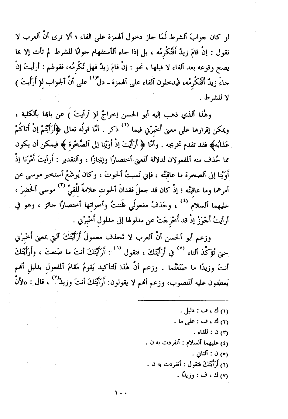 وزعم أبو الحسن أن العرب لا تحذف معمول أرأيتك التي بمعنى أخبرني حتى تؤكد التاء في أرأيتك، فتقول: أرأيتك أنت ما صنعت، وأرأيتك أنت وزيدًا ما صنعتما. وزعم أن هذا التأكيد يقوم مقام المفعول بدليل أنهم يعطفون عليه المنصوب، وزعم أنهم لا يقولون: أرأيتك أنت وزيد، قال: "لأن