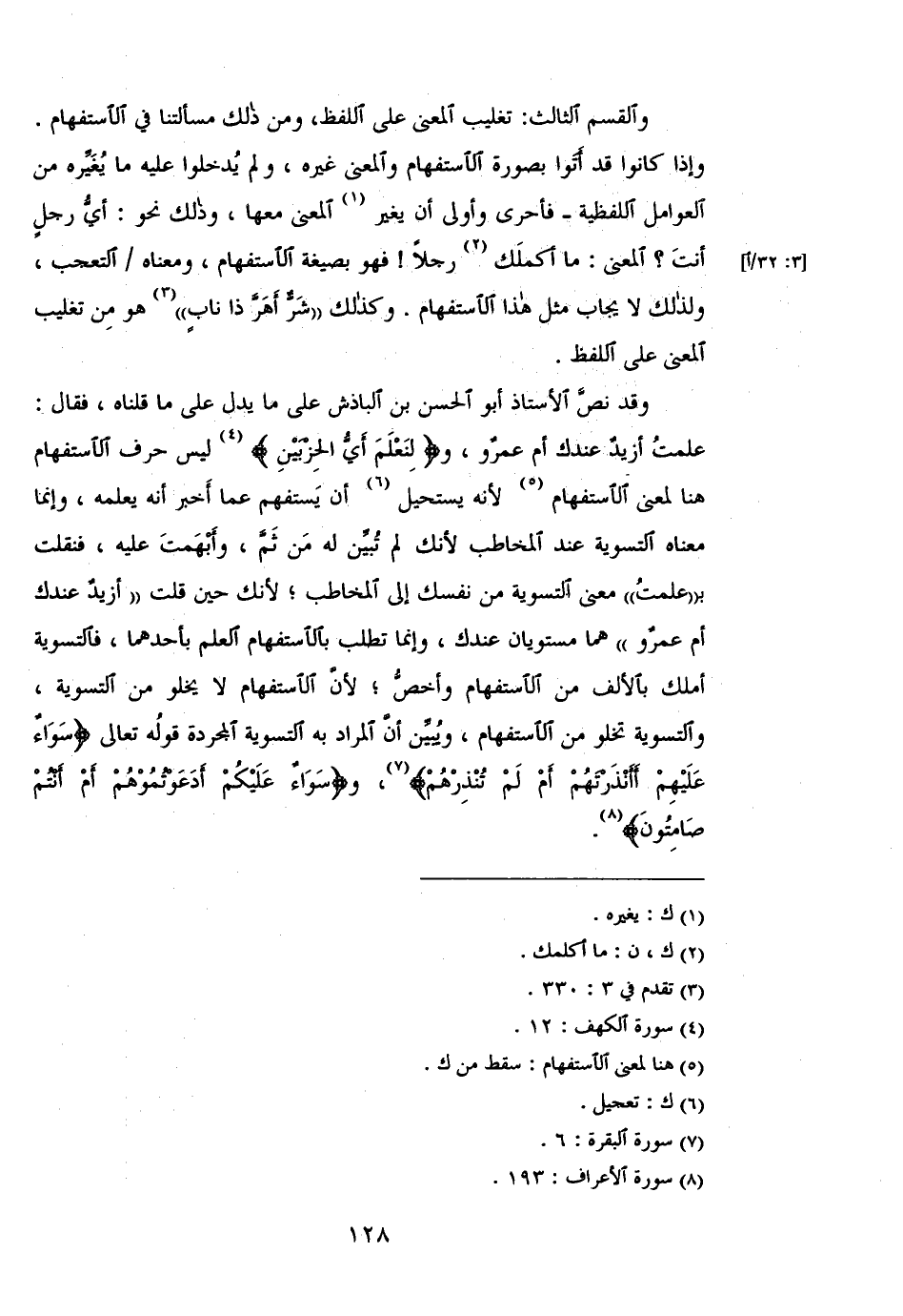 وقد نص الأستاذ أبو الحسن بن الباذش على ما يدل على قلناه، فقال: علمت أزيد عندك أم عمرو، و (لِنَعْلَمَ أَيُّ الْحِزْبَيْنِ) ليس حرف الاستفهام هنا لمعنى الاستفهام لأنه يستحيل أن يستفهم عما أخبر انه يعلمه، وإنما معناه التسوية عند المخاطب لأنك لم تبين له من ثم، وأبهمت عليه، فنقلت بـ "علمت" معنى التسوية من نفسك إلى المخاطب؛ لأنك حين قلت "أزيد عندك أم عمرو" هما مستويان عندك، وإنما تطلب بالاستفهام العلم بأحدهما، فالتسوية أملك بالألف من الاستفهام وأخص؛ لأن الاستفهام لا يخلو من التسوية، والتسوية تخلو من الاستفهام، ويبين أن المراد به التسوية المجردة قوله تعالى (سَوَاءٌ عَلَيْهِمْ أَأَنْذَرْتَهُمْ أَمْ لَمْ تُنْذِرْهُمْ)، (سَوَاءٌ عَلَيْكُمْ أَدَعَوْتُمُوهُمْ أَمْ أَنْتُمْ صَامِتُونَ).