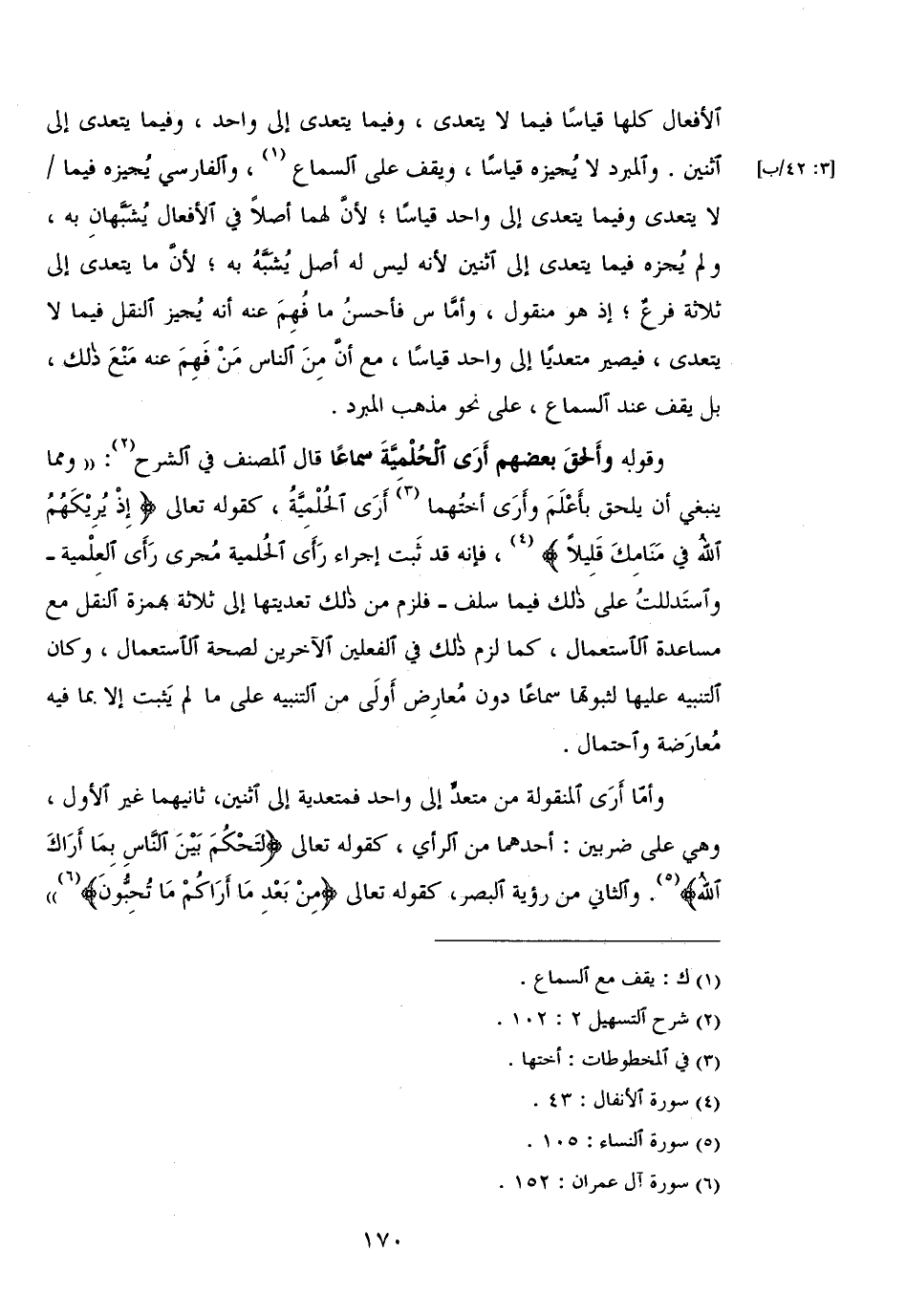 وقوله وألحق بعضهم أرى الحلمية سماعًا قال المصنف في الشرح: "ومما ينبغي أن يلحق بأعلم وأرى أختهما أرى الحلمية, كقوله تعالى {إِذْ يُرِيكَهُمُ اللَّهُ فِي مَنَامِكَ قَلِيلًا} , فإنه قد ثبت إجراء رأي الحلمية مجرى رأي العلمية - واستدللت على ذلك فيما سلف - فلزم من ذلك تعديتها إلا ثلاثة بهمزة النقل مع مساعدة الاستعمال, كما لزم ذلك في الفعلين الآخرين لصحة الاستعمال, وكان التنبيه عليها لثبوتها سماعًا دون معارض أولى من التنبيه على ما لم يثبت إلا بما فيه معارضة واحتمال.