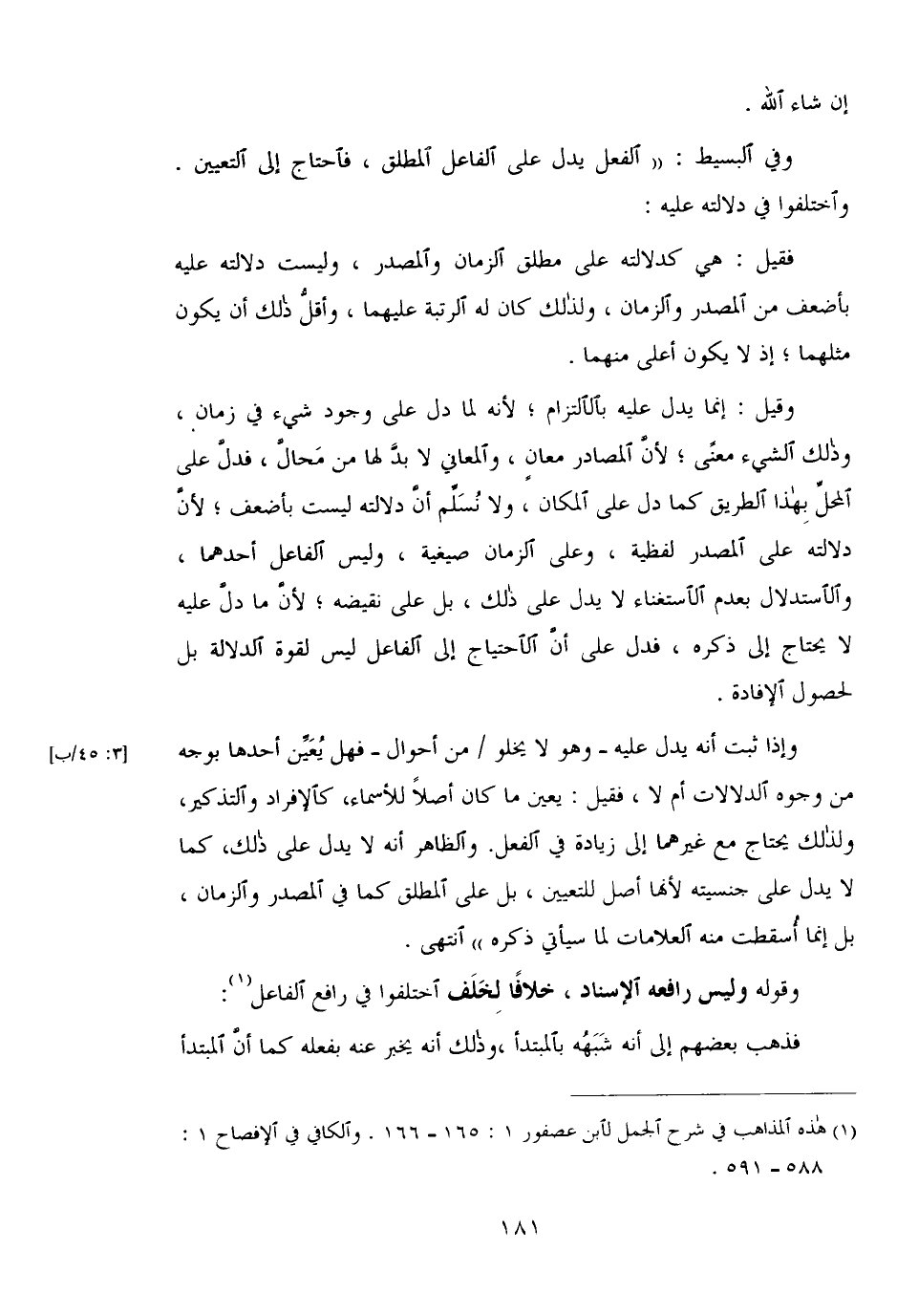 وإذا ثبت أنه يدل عليه- وهو لا يخلو/ من أحوال- فهل يعين أحدها بوجه من وجوه الدلالات أم لا, فقيل: يعين ما كان أصلا للأسماء, كالإفراد والتذكير, ولذلك يحتاج مع غيرهما إلى زيادة في الفعل. والظاهر أنه لا يدل على ذلك, كما لا يدل على جنسيته لأنها أصل للتعيين, بل على المطلق في المصدر والزمان, بل إنما اسقطت منه العلامات لما سيأتي ذكره)) انتهى.
