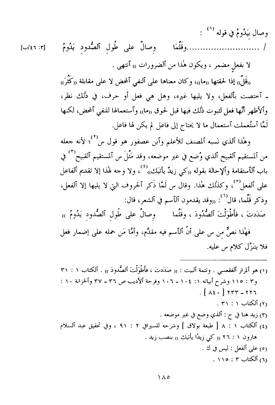 وهذا الذي نسبه المصنف للأعلم وابن عصفور هو قول س؛ لأنه جعله من المستقيم القبيح الذي وضع في غير موضعه, وقد مثل س المستقيم القبيح في باب الاستقامة والإحالة بقوله ((كي زيد يأتيك)) , ولا وجه لهذا إلا تقديم الفاعل على الفعل, وكذلك هذا. وقال س لما ذكر الحروف التي لا يليها إلا الفعل, وذكر قلما, قال: ((وقد يقدمون الاسم في الشعر قال:
