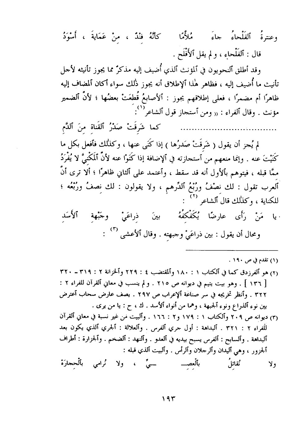 لم يجز أن يقول (شرقت صدرها) إذا كنى عنها، وكذلك فافعل بكل ما كنيت عنه. وإنما منعهم من استجازته في الإضافة إذا كنوا عنه لأن المكني لا يفرد مما قبله، فيتوهم بالأول أنه قد سقط، واعتمد على الثاني ظاهرًا؛ ألا ترى أن العرب تقول: لك نصف وربع الدرهم، ولا يقولون: لك نصف وربعه؛ للكناية، وكذلك قال الشاعر: