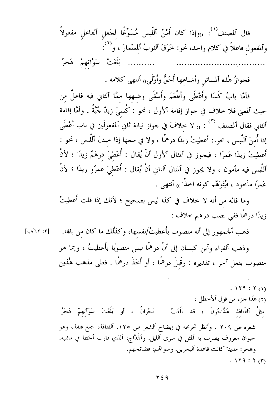فأما باب كسا وأعطى وأطعم وأسقى وشبهها مما الثاني فيه فاعل من حيث المعنى فلا خلاف في جواز إقامة الأول، نحو: كسي زيد جبة. وأما إقامة الثاني فقال المصنف: "لا خلاف في جواز نيابة ثاني المفعولين في باب أعطي إذا أمن اللبس، نحو: أعطيت زيدًا درهمًا، ولا في منعها إذا خيف اللبس، نحو: أعطيت زيدًا عمرًا، فيجوز في المثال الأول أن يقال: أعطي درهم زيدًا؛ لأن اللبس فيه مأمون، ولا يجوز في المثال الثاني أن يقال: أعطى عمرو زيدًا؛ لأن عمرًا مأخوذ، فيتوهم كونه آخذًا" انتهى.