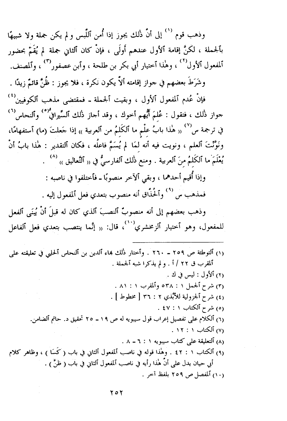وذهب قوم إلى أن ذلك يجوز إذا أمن اللبس ولم يكن جملة ولا شبيهًا بالجملة، لكن إقامة الأول عندهم أولى، فإن كان الثاني جملة لم يقم بحضور المفعول الأول، وهذا اختيار أبي بكر طلحة، وابن عصفور، والمصنف. وشرط بعضهم في جواز إقامته ألا يكون نكرة، فلا يجوز: ظن قائم زيد. فإن عدم المفعول الأول، وبقيت الجملة- فمقتضى مذهب الكوفيين جواز ذلك، فتقول: علم أيهم أخوك، وقد أجاز ذلك السيرافي والنحاس في ترجمة س "هذا باب علم ما الكلم من العربية" إذا جعلت (ما) استفهامًا، ونونت العلم، ونويت فيه أنه لما لم يسم فاعله، فكان التقدير: هذا باب أن يعلم الكلم من العربي. ومنع ذلك الفارسي في "التعاليق".