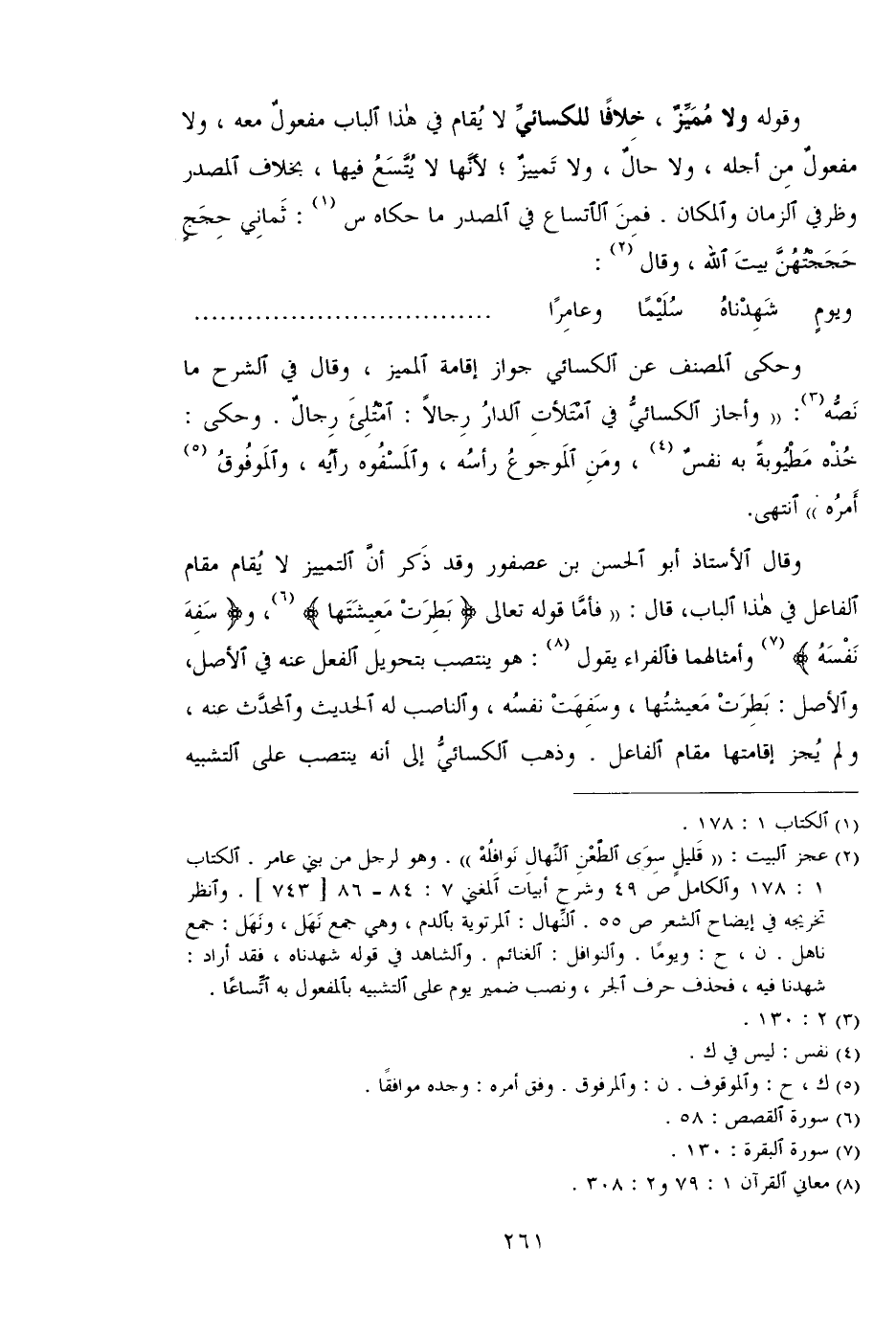 وقوله ولا مميز، خلافًا للكسائي لا يقام في هذا الباب مفعول معه، ولا مفعول من أجله، ولا حال، ولا تتميز؛ لأنها لا يتسع فيها، بخلاف المصدر وظرفي الزمان والمكان. فمن الاتساع في المصدر ما حكاه س: ثماني حجج حججتهن بيت الله، وقال: