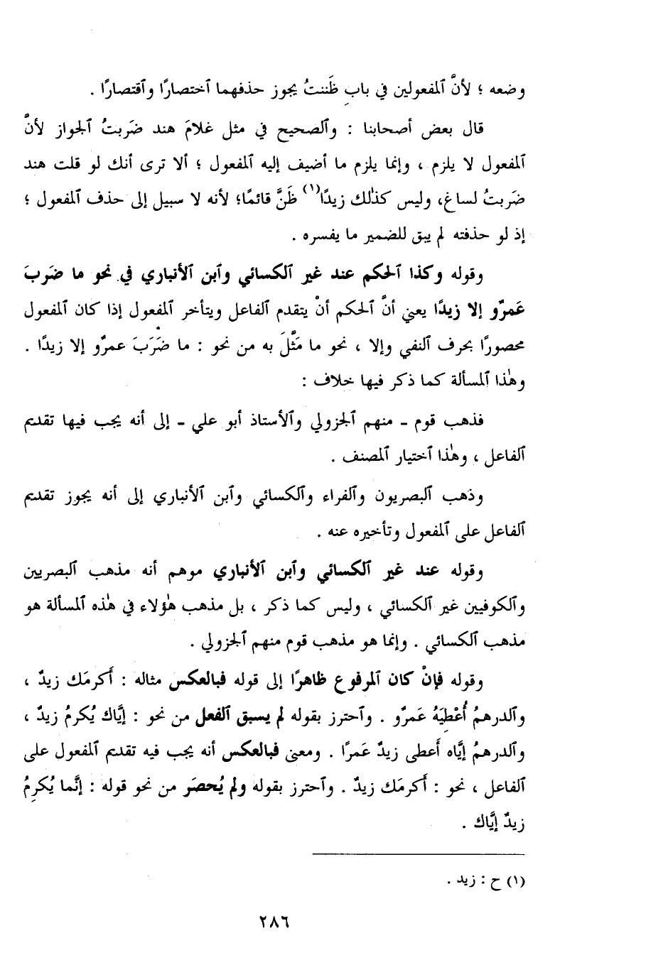 وقوله وكذا الحكم عند غير الكسائي وابن الأنباري في نحو ما ضرب عمرو إلا زيدًا يعني أن الحكم أن يتقدم الفاعل ويتأخر المفعول إذا كان المفعول محصورًا بحرف النفي وإلا، نحو ما مثل به من نحو: ما ضرب عمرو إلا زيدًا. وهذه المسألة كما ذكر فيها خلاف: