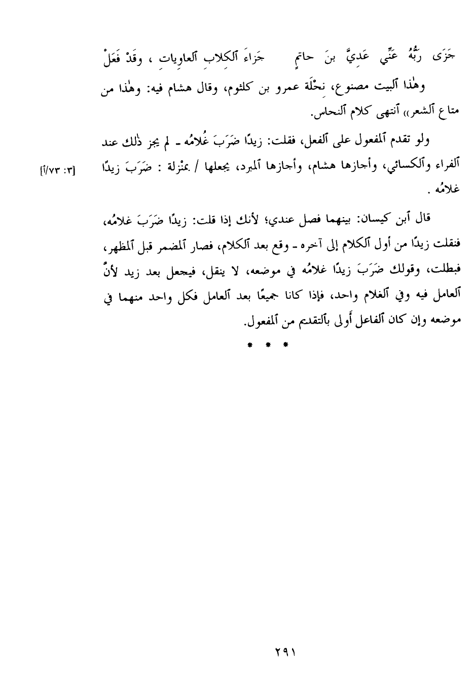 قال ابن كيسان: بينهما فصل عندي؛ لأنك غذا قلت: زيدًا ضرب غلامه، فنقلت زيدًا من أول الكلام إلى آخره _وقع بعد الكلام، فصار المضمر قبل المظهر، فبطلت، وقولك ضرب زيدًا غلامه في موضعه، لا ينقل، فيجعل بعد زيد لأن العامل فيه وفي الغلام واحد، فإذا كانا جميعًا بعد العامل فكل واحد منهما في موضعه وإن كان الفاعل أولى بالتقديم من المفعول.