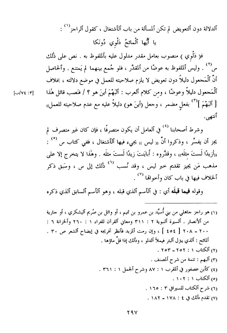 فـ (دلوي) منصوب بعامل مقدر مدلول عليه بالملفوظ به. نص على ذلك س. وليس الملفوظ به عوضًا من المقدر. فلو جمع بينهما لم يمتنع. والحاصل أن المجعول دليلًا دون تعويض لا يلزم صلاحيته للعمل في موضع دلالته، بخلاف المجعول دليلًا وعوضًا، ومن كلام العرب: البهم أين هو؟ /فنصب قائل هذا] البهم [بفعل مضمر، وجعل (أين هو) دليلًا عليه مع عدم صلاحيته للعمل" انتهى.