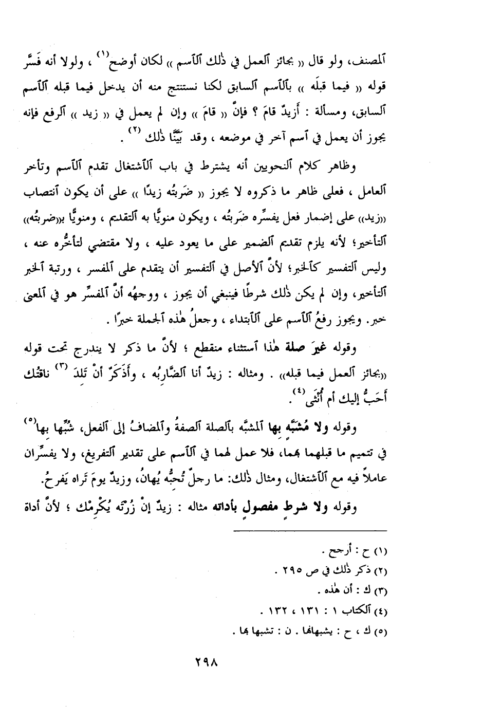 وقوله ولا مشبه بها المشبه بالصلة الصفة والمضاف إلى الفعل، شبها بها في تتميم ما قبلهما بهما، فلا عمل لهما في الاسم على تقدير التفريغ، ولا يفسران عاملًا فيه مع الاشتغال، ومثال ذلك: ما رجل تحبه يهان، وزيد يوم تراه يفرح.