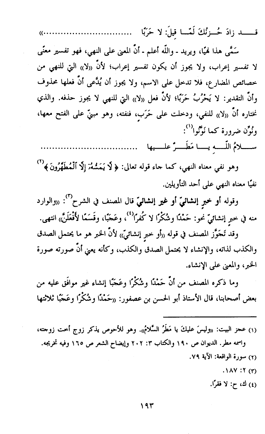 سمى هذا نهياً، ويريد- والله أعلم- أن المعنى على النهي، فهو تفسير معنى لا تفسير إعراب، ولا يجوز أن يكون تفسير إعراب؛ لأن «لا» التي للنهي من خصائص المضارع، فلا تدخل على الاسم، ولا يجوز أن يدعى أن فعلها محذوف وأن التقدير: لا يحرب حرباً؛ لأن فعل «لا» التي للنهي لا يجوز حذفه. والذي نختاره أن «لا» للنفي، ودخلت على حربٍ، فنفته، وهو مبني على الفتح معها، ونون ضرورة كما نونوا: