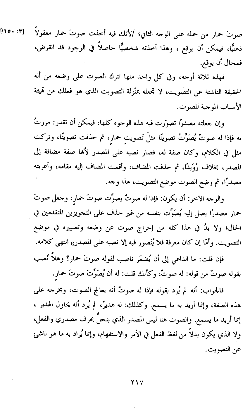 والوجه الآخر: أن يكون: فإذا له صوت يصوت صوت حمار، وجعل صوت حمار مصدراً يصل إليه يصوت بنفسه من غير حذف على التجويزين المتقدمين في الحال؛ ولا بد في هذا كله من إخراج صوت عن وضعه وتصييره في موضع التصويت. وأما إن كان معرفة فلا يتصور فيه إلا نصبه على المصدر» انتهى كلامه.