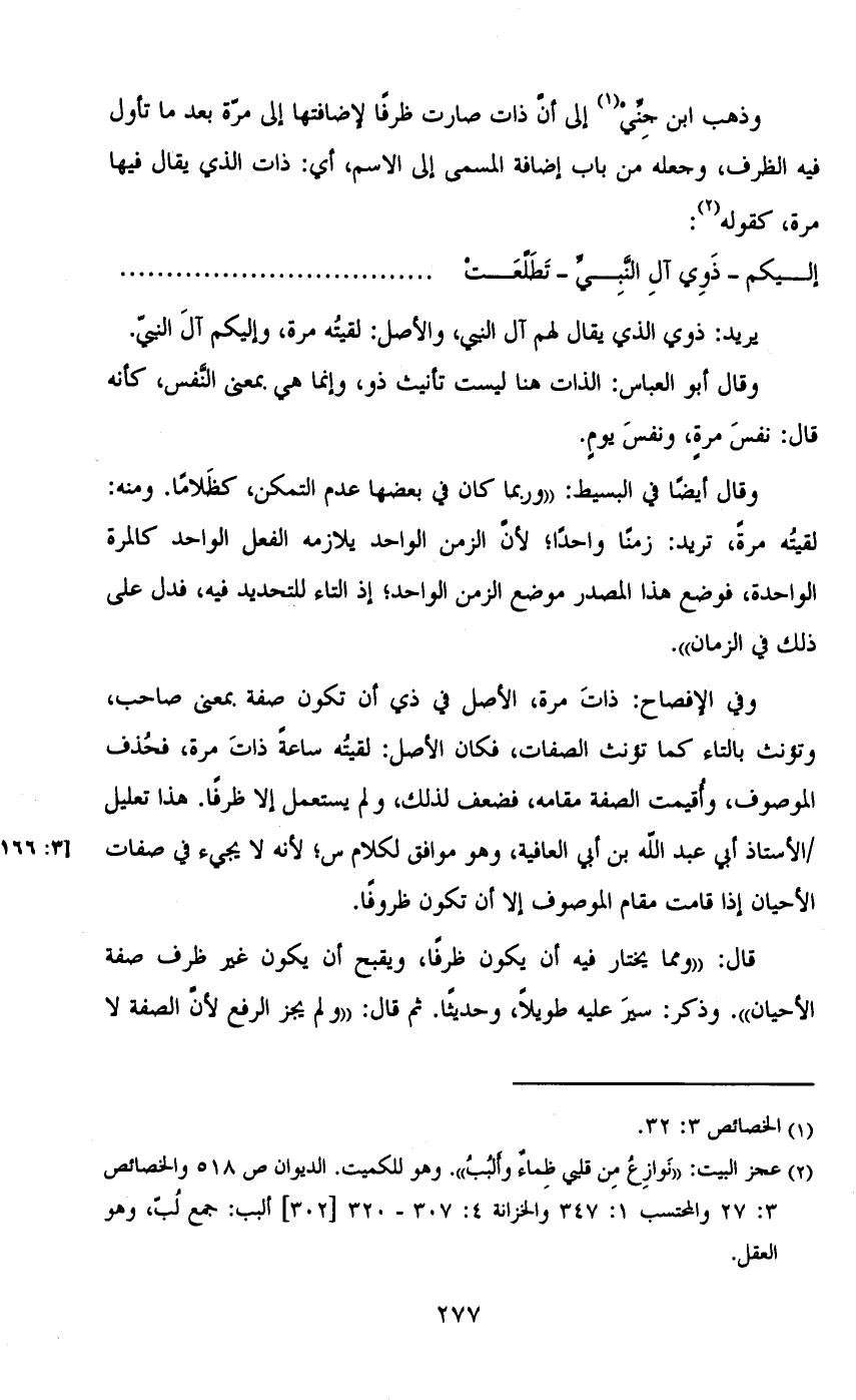 وذهب ابن جني إلى أن ذات صارت ظرفاً لإضافتها إلى مرة بعد ما تأول فيه الظرف، وجعله من باب إضافة المسمى إلى الاسم، أي: ذات الذي يقال فيها مرة، كقوله: