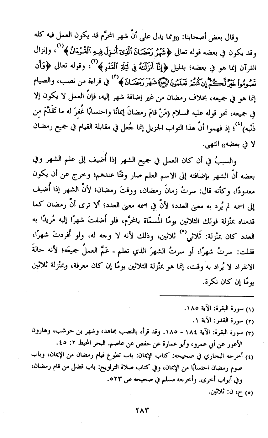 وقال بعض أصحابنا: «ومما يدل على أن شهر المحرم قد يكون العمل فيه كله وقد يكون في بعضه قوله تعالى {شَهْرُ رَمَضَانَ الَّذِي أُنزِلَ فِيهِ الْقُرْآنُ}، وإنزال القرآن إنما هو في بعضه؛ بدليل {إِنَّا أَنزَلْنَاهُ فِي لَيْلَةِ الْقَدْرِ}، وقوله تعالى {وَأَنْ تَصُومُوا خَيْرٌ لَكُمْ إِنْ كُنتُمْ تَعْلَمُونَ (184) شَهْرُ رَمَضَانَ} في قراءة من نصب، والصيام إنما هو في جميعه، بخلاف رمضان من غير إضافة شهر إليه، فإن العمل لا يكون إلا في جميعه، نحو قوله عليه السلام (من قام رمضان إيماناً واحتساباً غفر له ما تقدم من ذنبه)؛ إذ فهموا أن هذا الثواب الجزيل إنما جعل في مقابلة القيام في جميع رمضان لا في بعضه» انتهى.