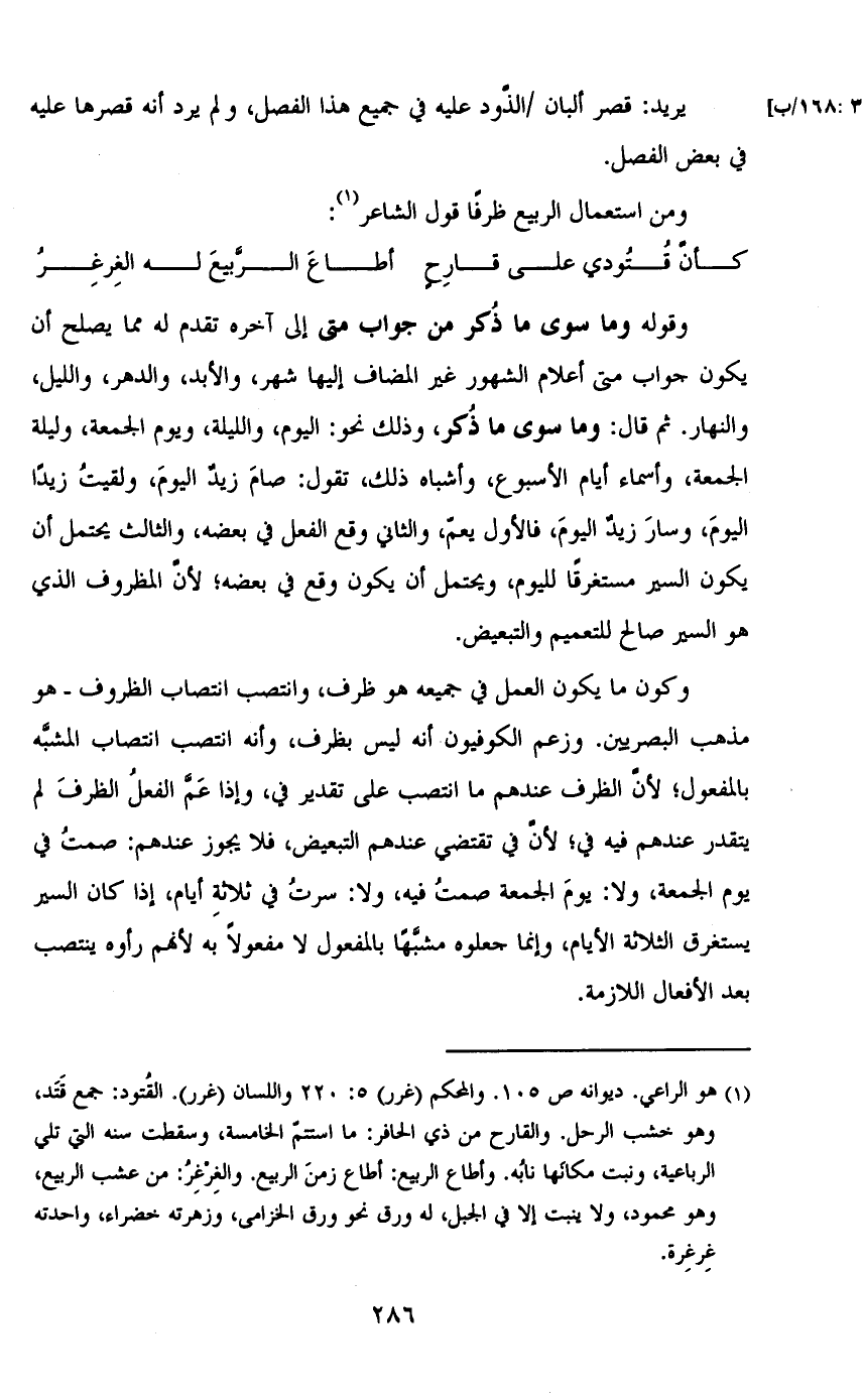 وكون ما يكون العمل في جميعه هو ظرف، وانتصب انتصاب الظروف- هو مذهب البصريين. وزعم الكوفيون أنه ليس بظرف، وأنه انتصب انتصاب المشبه بالمفعول؛ لأن الظرف عندهم ما انتصب على تقدير في، وإذا عم الفعل الظرف لم يتقدر عندهم فيه في؛ لأن في تقتضي عندهم التبعيض، فلا يجوز عندهم: صمت في يوم الجمعة، ولا: يوم الجمعة صمت فيه، ولا: سرت في ثلاثة أيام، إذا كان السير يستغرق الثلاثة الأيام، وإنما جعلوه مشبهاً بالمفعول لا مفعولاً به لأنهم رأوه ينتصب بعد الأفعال اللازمة.