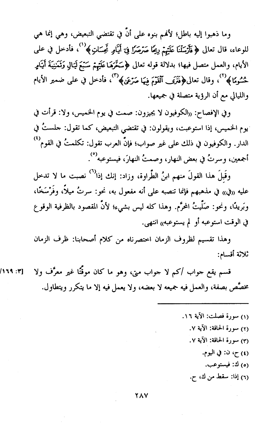 وما ذهبوا إليه باطل؛ لأنهم بنوه على أن في تقتضي التبعيض، وهي إنما هي للوعاء، قال تعالى {فَأَرْسَلْنَا عَلَيْهِمْ رِيحًا صَرْصَرًا فِي أَيَّامٍ نَحِسَاتٍ}، فأدخل في على الأيام، والعمل متصل فيها؛ بدلالة قوله تعالى {سَخَّرَهَا عَلَيْهِمْ سَبْعَ لَيَالٍ وَثَمَانِيَةَ أَيَّامٍ حُسُومًا}، وقال تعالى {فَتَرَى الْقَوْمَ فِيهَا صَرْعَى}، فأدخل في على ضمير الأيام والليالي مع أن الرؤية متصلة في جميعها.