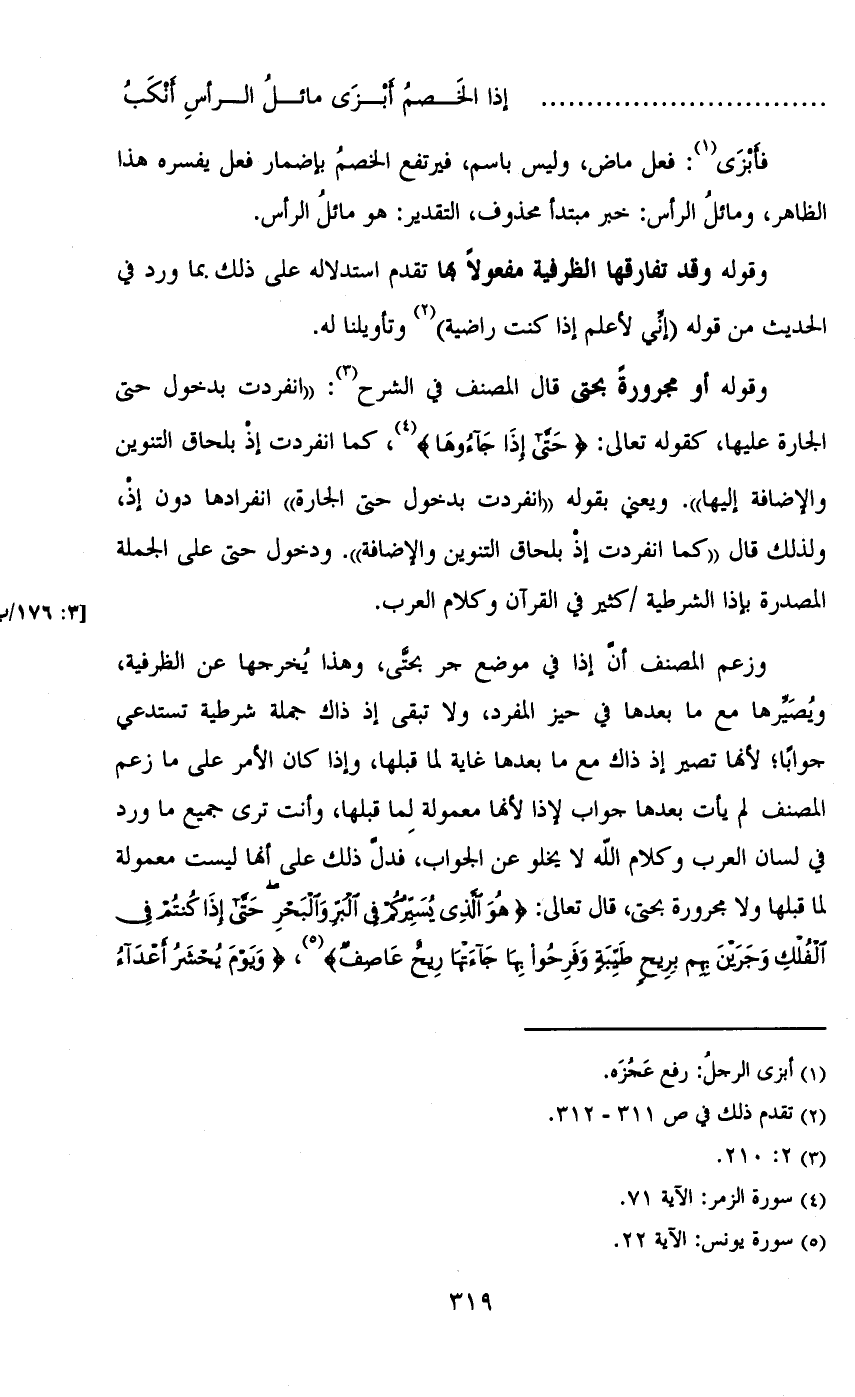 وزعم المصنف أنَّ إذا في موضع جر بحتَّي، وهذا يُخرجها عن الظرفية، ويُصَيَّرها مع ما بعدها في حيز المفرد، ولا تبقي إذ ذلك جملة شرطية تستدعي جواباً؛ لأنها تصير إذ ذاك مع ما بعدها لما قبلها، وإذا كان الأمر علي ما زعم المصنف لم يأت بعدها جواب لاذا لأنها معمولة لما قبلها، وأنت تري جميع ما ورد في لسان العرب وكلام الله لا يخلو عن الجواب، فدلَّ ذلك علي أنها ليست معمولة لما قبلها ولا مجرورة بحتي، قال تعالي {هُوَ الَّذِي يُسَيِّرُكُمْ فِي الْبَرِّ وَالْبَحْرِ حَتَّى إِذَا كُنْتُمْ فِي الْفُلْكِ وَجَرَيْنَ بِهِمْ بِرِيحٍ طَيِّبَةٍ وَفَرِحُوا بِهَا جَاءَتْهَا رِيحٌ عَاصِفٌ}، {وَيَوْمَ يُحْشَرُ أَعْدَآءُ