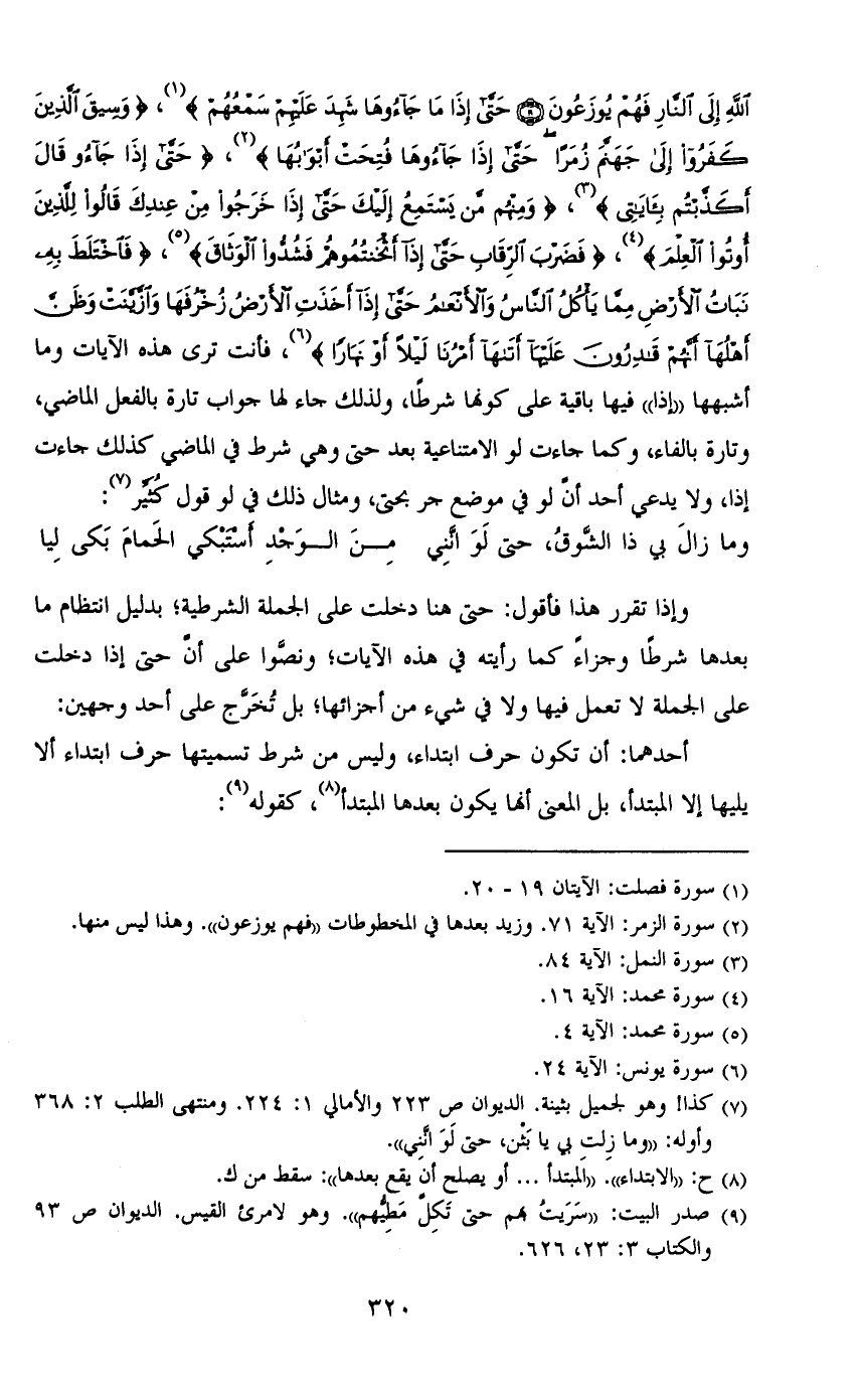 الله إِلَى النار فَهُمْ يُوزَعُونَ - حتى إِذَا مَا جَآءُوهَا شَهِدَ}، {وَسِيقَ الَّذِينَ كَفَرُوا إِلَى جَهَنَّمَ زُمرَاً حَتَّى إِذَا جَاءُوهَا فُتِحَتْ أَبْوَابُهَا}، {حَتَّى إِذَا جَاءُوا قَالَ أَكَذَّبْتُم بِآيَاتِي}، {وَمِنْهُمْ مَنْ يَسْتَمِعُ إِلَيْكَ حَتَّى إِذَا خَرَجُوا مِنْ عِنْدِكَ قَالُوا لِلَّذِينَ أُوتُوا الْعِلْمَ}، {فَضَرْبَ الرِّقَابِ حَتَّى إِذَا أَثْخَنْتُمُوهُمْ فَشُدُّوا الْوَثَاقَ}، {فَاخْتَلَطَ بِهِ نَبَاتُ الْأَرْضِ مِمَّا يَاكُلُ النَّاسُ وَالْأَنْعَامُ حَتَّى إِذَا أَخَذَتِ الْأَرْضُ زُخْرُفَهَا وَازَّيَّنَتْ وَظَنَّ أَهْلُهَا أَنَّهُمْ قَادِرُونَ عَلَيْهَا أَتَاهَا أَمْرُنَا لَيْلًا أَوْ نَهَارًا}، فأنت تري هذه الآيات وما أشبهها «إذا» فيها باقية علي كونها شرطاً، ولذلك جاء لها جواب تارة بالفعل الماضي، وتارة بالفاء، وكما جاءت لو الإمتناعيه بعد حتي وهي شرط في الماضي كذلك جاءت إذا، ولا يدعي أحد أنَّ لو في موضع جر بحتي، ومثال ذلك في لو قول كُثَيّر: