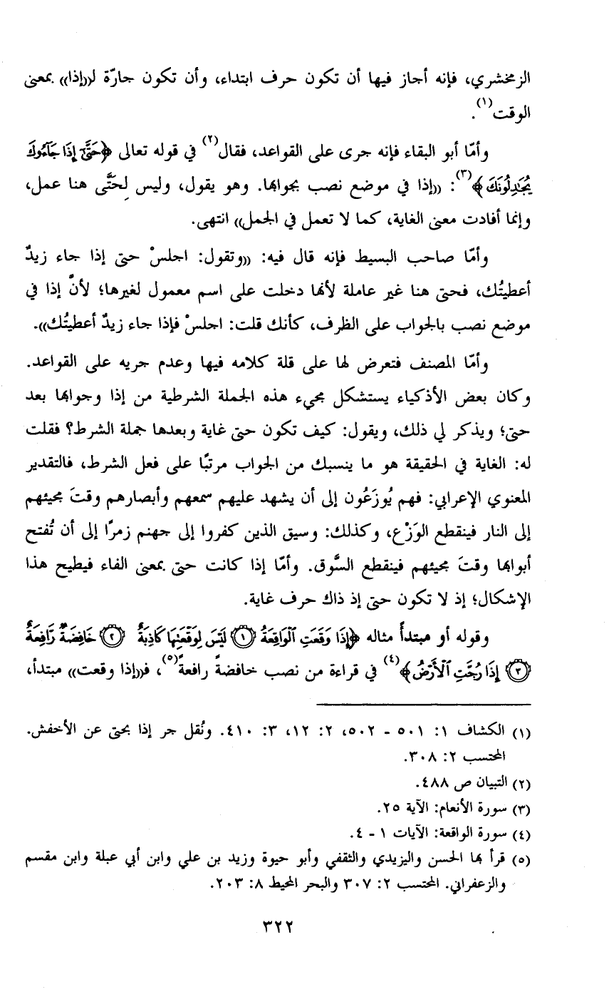 وأمّا المصنف فتعرض لها علي قلة كلامه فيها وعدم جريه علي القواعد وكان بعض الأذكياء يستشكل مجيء هذه الجملة الشرطية من إذا وجوابها بعد حتى؛ ويذكر لي ذلك، ويقول: كيف تكون حتي غاية وبعدها جملة الشرط؟ فقلت له: الغاية في الحقيقة هو ما ينسبك من الجواب مرتباً علي فعل الشرط، فالتقدير المعنوي الإعرابي: فهم يُوزَعًون إلي أن يشهد عليهم سمعهم وأبصارهم وقتَ مجيئهم إلي النار فينقطع الوَزْع، وكذلك: وسيق الذين كفروا إلي جهنم زمراً إلي أن تُفتح أبوابها وقتَ مجيئهم فينقطع السَّوق. وأمّا إذا كانت حتى بمعني الفاء فيطيح هذا الإشكال؛ إذ لا تكون حتى إذ ذاك حرف غاية.