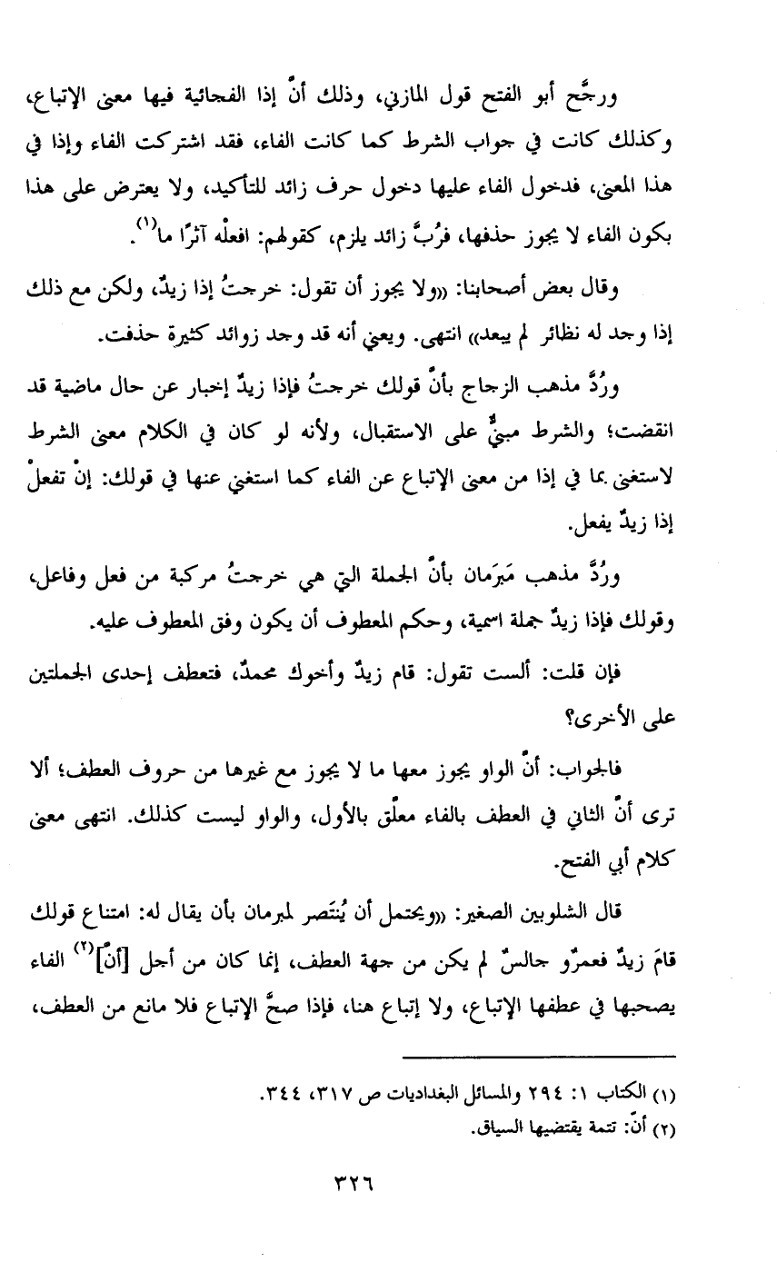 قال الشلوبين الصغير: «ويحتمل أن يُنتَصر لمبرمان بأن يقال له: امتناع قولك قامَ زيدٌ فعمرٌو جالسٌ لم يكن من جهة العطف، إنما كان من أجل [أنَّ] الفاء يصحبها في عطفها الإتباع، ولا إتباع هنا، فإذا صحَّ الإتباع فلا مانع من العطف،
