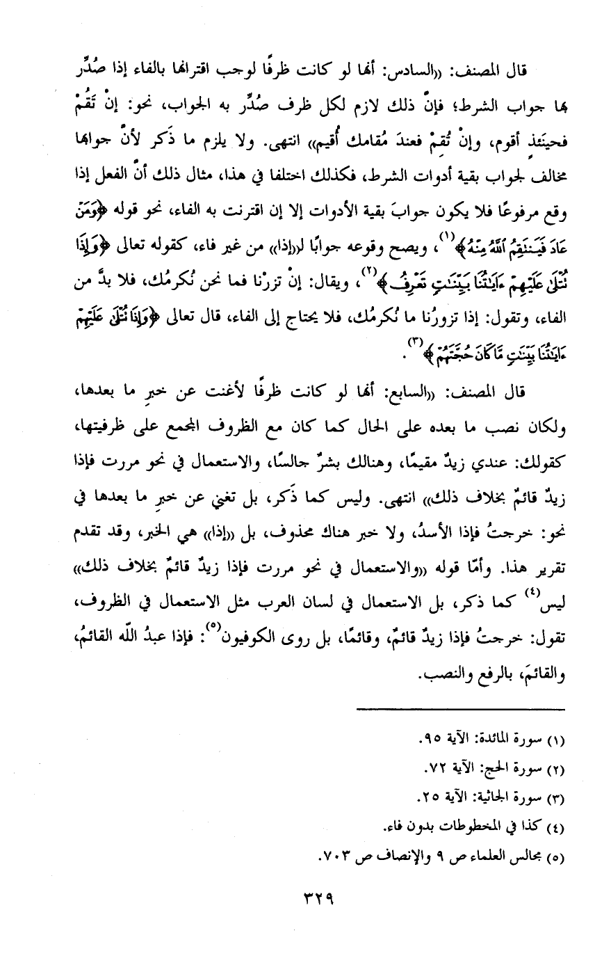 قال المصنف: «السادس: أنها لو كانت ظرفاً لوجب اقترانها بالفاء إذا صُدِّر بها جواب الشرط؛ فإنَّ ذلك لازم لكل ظرف صُدِّر به الجواب، نحو: إنْ تَقُمْ فحينَئِذ أقوم، وإنْ تُقِمْ فعندَ مُقامك أُقيم» انتهي. ولا يلزم ما ذَكر لأنَّ جوابها مخالف لجواب بقية أدوات الشرط، فكذلك اختلفا في هذا، مثال ذلك أنَّ الفعل إذا وقع مرفوعاً فلا يكون جوابَ بقية الأدوات إلا إن اقترنت به الفاء، نحو قوله {وَمَنْ عَادَ فَيَنْتَقِمُ اللهُ مِنْهُ}، ويصح وقوعه جواباً لـ «إذا» من غير فاء، كقوله تعالي {وَإِذَا تُتْلَى عَلَيْهِمْ آيَاتُنَا بَيِّنَاتٍ تَعْرِفُ}، ويقال: إنْ تزرْنا فما نحن نُكرمُك، فلا بدَّ من الفاء، وتقول: إذا تزورُنا ما نُكرمُك، فلا يحتاج إلي الفاء، قال تعالي {وَإِذَا تُتْلَى عَلَيْهِمْ آيَاتُنَا بَيِّنَاتٍ مَا كَانَ حُجَّتَهُمْ}.