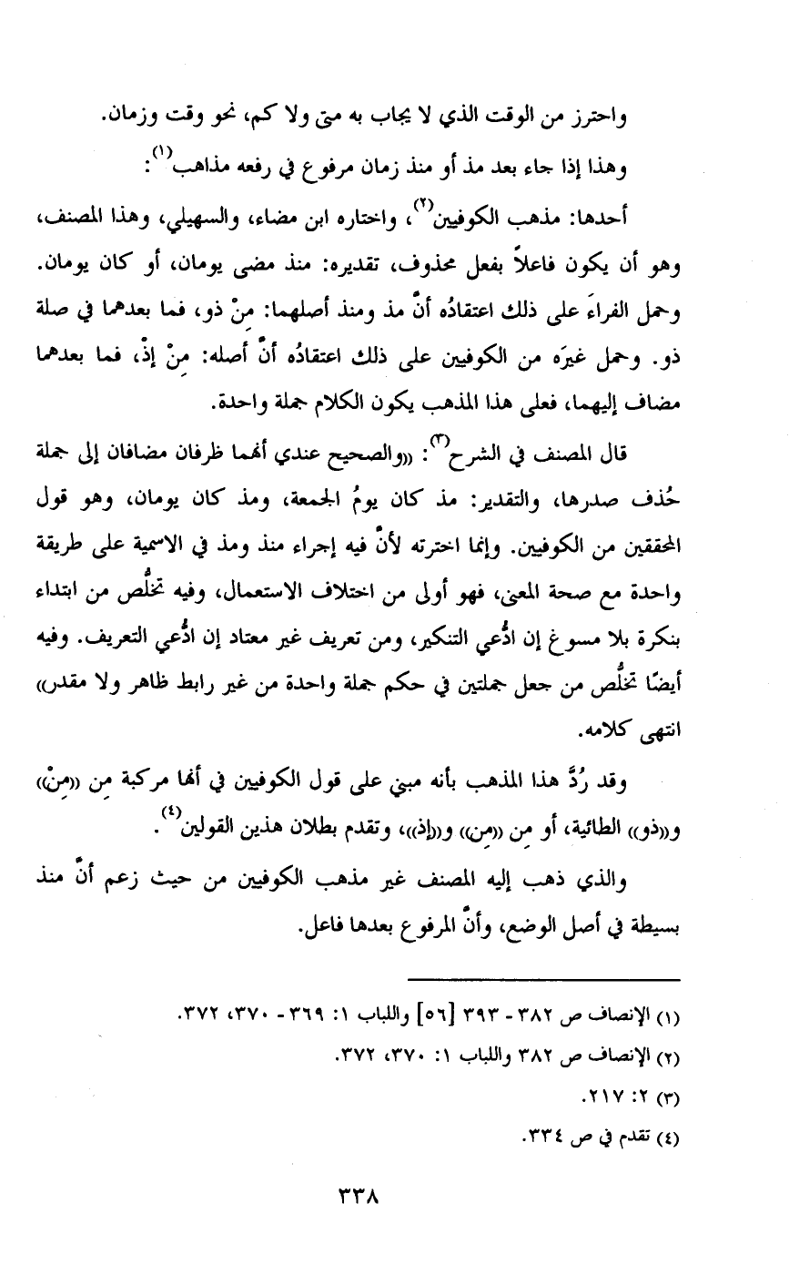 قال المصنف في الشرح: «والصحيح عندي أنهما ظرفان مضافان إلي جملة حُذف صدرها، والتقدير: مذ كان يومُ الجمعة، ومذ كان يومان، وهو قول المحققين من الكوفيين. وإنما اخترته لأنَّ فيه إجراء منذ ومذ في الاسمية علي طريقة واحدة مع صحة المعني، فهو أولي من اختلاف الاستعمال، وفيه تخلُّص من ابتداء بنكرة بلا مسوغ إن ادُّعي التنكير، ومن تعريف غير معتاد إن ادُّعي التعريف. وفيه أيضاً تخلُّص من جعل جملتين في حكم جملة واحدة من غير رابط ظاهر ولا مقدر» انتهي كلامه.