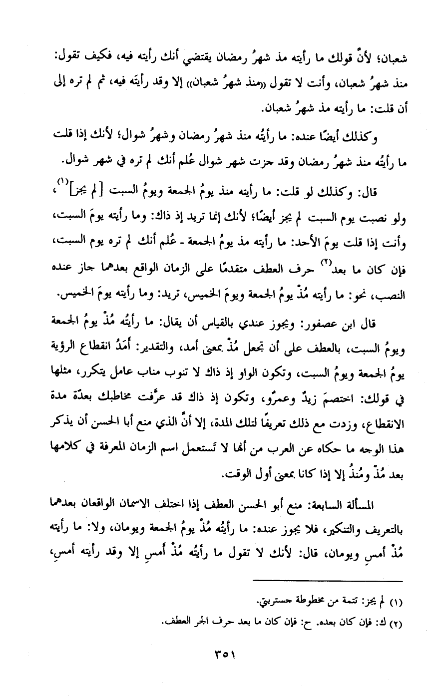 وكذلك أيضاَ عنده: ما رأيتُه منذ شهرُ رمضان وشهرُ شوال؛ لأنك إذا قلت ما رأيتُه منذ شهرُ رمضان وقد جزت شهر شوال عُلم أنك لم تره في شهر شوال.