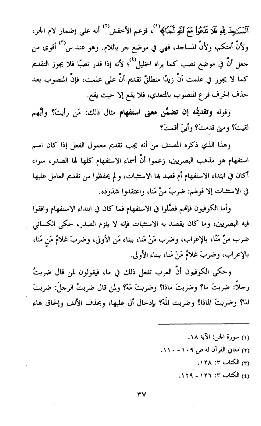 الْمَسَاجِدَ لِلَّهِ فَلا تَدْعُوا مَعَ اللَّهِ أَحَدًا}، فزعم الأخفش أنه على إضمار لام الجر، ولأن أمتكم، ولأن المساجد، فهي في موضع جر باللام. وهو عند س أقوى من جعل أن في موضع نصب كما يراه الخليل؛ لأنه إذا قدر نصباً فلا يجوز التقديم كما لا يجوز في علمت أن زيداً منطلق تقديم ان على علمت، فإن المنصوب بعد حذف الحرف فرع لمنصوب بالتعدي، فلا يقع إلا حيث يقع.