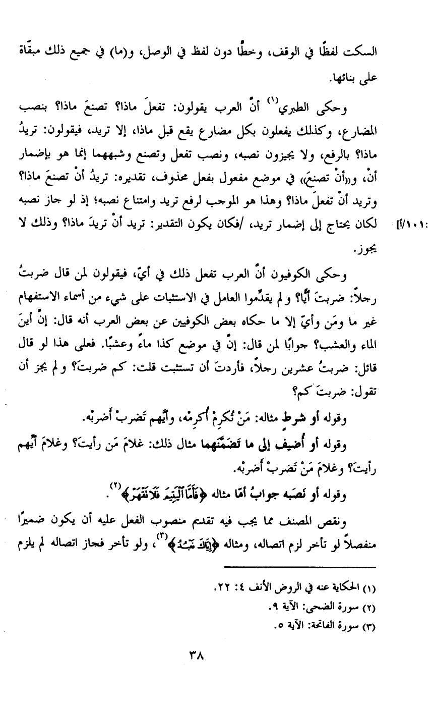 وحكى الطبري أن العرب يقولون: تفعل ماذا؟ تصنع ماذا؟ بنصب المضارع، وكذلك يفعلون بكل مضارع يقع قبل ماذا، إلا تريد، فيقولون: تريد ماذا؟ بالرفع، ولا يجيزون نصبه، ونصب تفعل وتصنع شبههما إنما هو بإضمار أن، و ((أن تصنع)) في موضع مفعول بفعل محذوف، تقديره: تريد أن تصنع ماذا؟ وتريد أن تفعل ماذا؟ وهذا هو الموجب لرفع تريد وامتناع نصبه؛ إذ لو جاز نصبه لكان يحتاج إلى إضمار تريد،/ فكان يكون التقديم: تريد أن تريد ماذا؟ وذلك لا يجوز. ... [3: 101/أ]