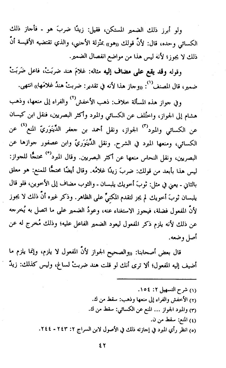 وفي جواز هذه المسألة خلاف: ذهب الأخفش والفراء إلى منعها، وذهب هشام إلى جواز، واختلف عن الكسائي والمبرد وأكثر البصريين، فنقل ابن كيسان عن الكسائي والمبرد الجواز، ونقل أحمد بن جعفر الدينوري المنع عن الكسائي، ومنعها المبرد في الشرح. ونقل الدينوري وابن عصفور جوازها عن البصريين، ونقل النحاس منعها عن أكثر البصريين. وقال المبرد محتجاً للجواز: ليس هذا بأبعد من قولك: ضرب زيداً غلامه. وقال أيضاً محتجاً للمنع: هو معلق بالثاني- يعني في مثل: ثوب أخويك يلبسان- والثوب مضاف إلى الأخوين، فلو قال يلبسان ثوب أخويك لم يجز لتقدم المكني على الظاهر. وذكر غيره أن ذلك لا يجوز لأن المفعول فضلة، فيجوز الاستغناء عنه، وعود الضمير على ما اتصل به يخرجه عن ذلك لأنه يلزم ذكر المفعول ليعود الضمير الفاعل عليه؛ وذلك مُخرج له عن أصل وضعه.