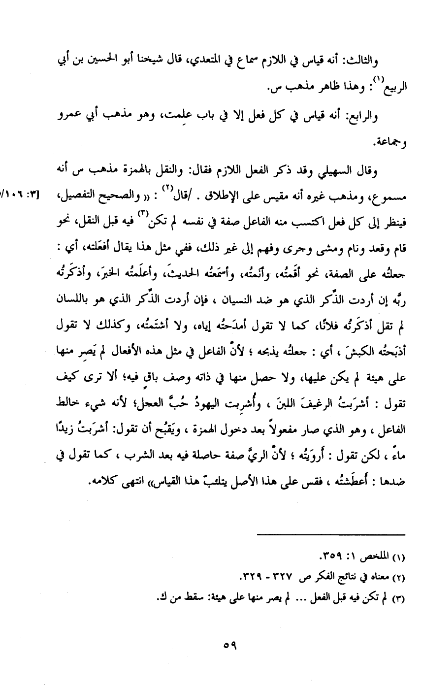 وقال السهيلي وقد ذكر الفعل اللازم فقال: والقتل بالهمزة مذهب س أنه مسموع، ومذهب غيره أنه مقيس على الإطلاق. /قال: ((والصحيح والتفصيل، فينظر إلى كل فعل اكتسب منه الفاعل صفة في نفسه لم تكن فيه النقل، ونحو قام وقعد ونام ومشى وجرى وفهم إلى غير ذك، ففي مثل هذا يقال أفعلته، أي: جعلته على الصفة، نحو أقمته، وأنمته، وأسمعته الحديث، وأعلمته الخبر، وأذكرته ربه إن أردت الذكر الذي هو ضد النسيان، فإن أردت الذكر الذي هو باللسان لم تقل أذكرته فلاناً، كما لا تقول أمدحته إياه، ولا أشتمته، وكذلك لا تقول أذبحته الكبش، أي: جعلته يذبحه؛ لأن الفاعل في مثل هذه الأفعال لم يصر منها على هيئة لم يكن عليها، ولا حصل منها في ذاته وصف باقٍ فيه؛ ألا ترى كيف تقول: أشربت الرغيف اللبن، وأشربت اليهود حب العجل؛ لأنه شيء خالط الفاعل، وهو الذي صار مفعولاً بعد دخول الهمزة، ويقبح أن تقول: أشربت زيداً ماءً، لكن تقول: أرويته؛ لأن الري صفة حاصلة فيه بعد الشرب، كما تقول في ضدها: أعطشته، فقس على هذا الأصل يتلئب هذا القياس)) انتهى كلامه.
