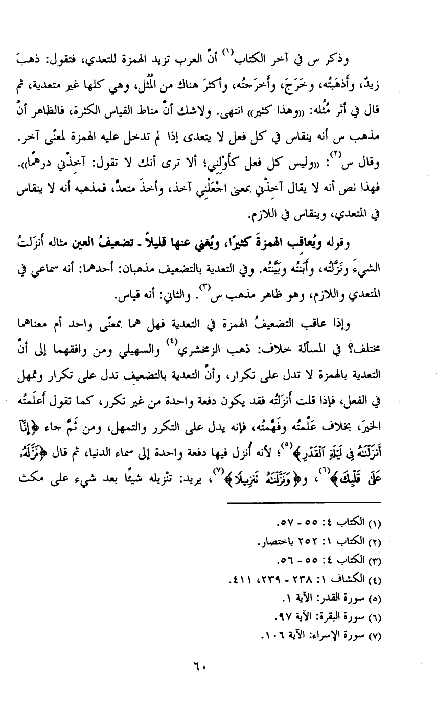 وذكر س في آخر الكتاب أن العرب تزيد الهمزة للتعدي، فتقول: ذهب زيد، وأذهبته، وخرج، وأخرجته، وأكثر هناك من المثل، وهي كلها غير متعدية، ثم قال في أثر مثله: ((وهذا كثير)) انتهى. ولا شك أن مناط القياس الكثرة، فالظاهر أن مذهب س أنه ينقاس في كل فعلا لا يتعدى إذا لم تدخل عليه الهمزة لمعنى آخر. وقال س: ((وليس كل فعل كأولني؛ ألا ترى أنك لا تقول: آخذني درهماً)). فهذا نص على أنه لا يقال آخذني بمعنى اجعلني آخذ، وأخذ متعد، فمذهبه أنه لا ينقاس في المتعدي، وينقاس في اللازم.