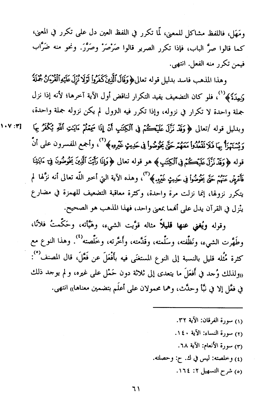 وهذا المذهب فاسد بدليل قوله تعالى {وَقَالَ الَّذِينَ كَفَرُوا لَوْلا نُزِّلَ عَلَيْهِ الْقُرْآنُ جُمْلَةً وَاحِدَةً}، فلو كان التضعيف يفيد التكرار لناقض أول الآية آخرها؛ لأنه إذا نزل جملة واحدة لا تكرار في نزوله، وإذا تكرر فيه النزول لم يكن نزوله جملة واحدة، وبدليل قوله/ تعالى {وَقَدْ نَزَّلَ عَلَيْكُمْ فِي الْكِتَابِ أَنْ إِذَا سَمِعْتُمْ آيَاتِ اللَّهِ يُكْفَرُ بِهَا وَيُسْتَهْزَأُ بِهَا فَلا تَقْعُدُوا مَعَهُمْ حَتَّى يَخُوضُوا فِي حَدِيثٍ غَيْرِهِ}، وأجمع المفسرون على أن {قوله وَقَدْ نَزَّلَ عَلَيْكُمْ فِي الْكِتَابِ} هو قوله تعالى {وَإِذَا رَأَيْتَ الَّذِينَ يَخُوضُونَ فِي آيَاتِنَا فَأَعْرِضْ عَنْهُمْ حَتَّى يَخُوضُوا فِي حَدِيثٍ غَيْرِهِ}، وهذه الآية التي أخبر الله تعالى أنه نزلها لم يتكرر نزولها، إنما نزلت مرة واحدة، وكثرة معاقبة التضعيف للهمزة في مضارع ينزل في القرآن يدل على أنهما بمعنى واحد، فهذا المذهب هو الصحيح.