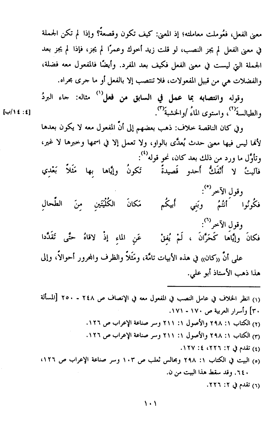 وفي كان الناقصة خلاف: ذهب بعضهم إلي أن لمفعول معه لا يكون بعدها لأنها ليس فيها معني حدث يعدي بالواو، ولا تعمل إلا في اسمها وخبرها لا غير، وتأول ما ورد من ذلك بعد كان، نحو قوله: