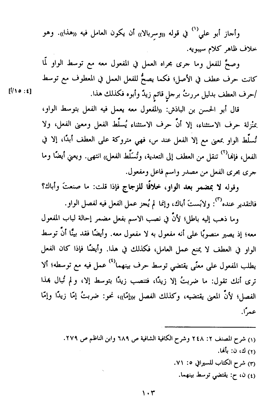 وصح الفعل وما جري مجراه العمل في المفعول معه مع توسط الواو لما كانت حرف عطف في الأصل؛ فكما يصح للفعل العمل في المعطوف مع توسط / [4: 15/ أ] دليل مررت برجل قائم زيد وأبوه فكذلك هذا.